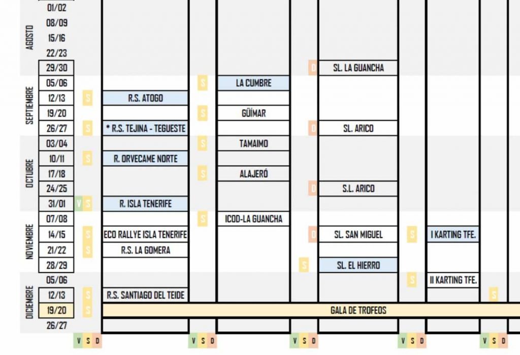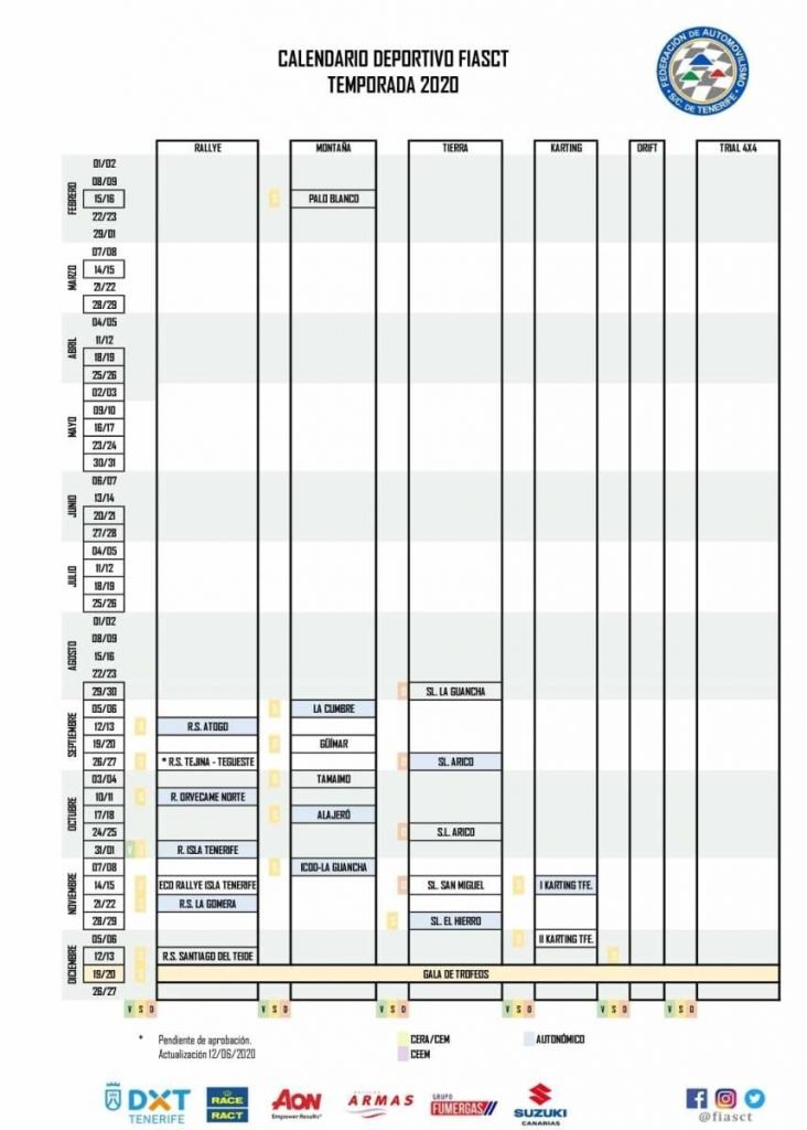 En el nuevo calendario figuran un total de 19 competiciones, con actividad todos los fines de semana hasta la misma víspera de navidad. En la modalidad de rallyes se ha conseguido mantener dos pruebas, como son el Rallye Orvecame Norte y el Rallye Isla Tenerife, así como también el ECO Rallye Isla Tenerife. La modalidad de Rallysprint contará con la nada despreciable organización de cuatro pruebas: Rallysprint de Atogo, Rallysprint Tejina-Tegueste (pendiente de aprobación), Rallysprint de La Gomera y Rallysprint Santiago del Teide.