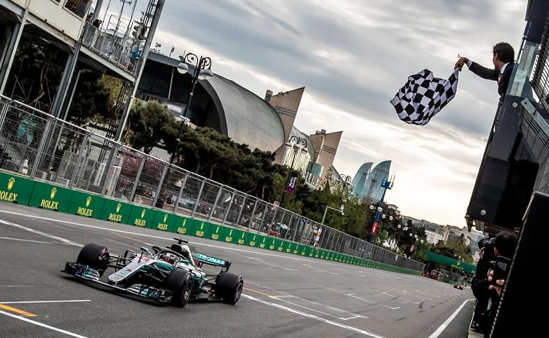 El piloto británico Lewis Hamilton (Mercedes) venció este domingo en Bakú, en la locura del Gran Premio de Azerbaiyán, beneficiado por el drama de su compañero, el finlandés Valtteri Bottas, que pinchó a dos vueltas del final cuando lideraba un carrera plagada de choques e incidentes.