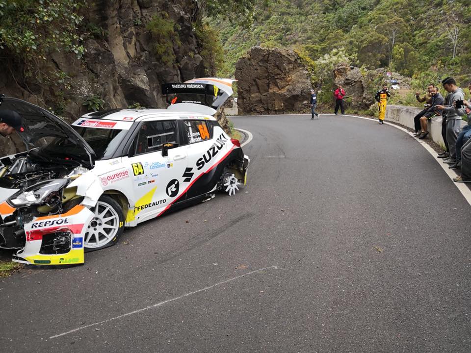 Además, en el TC 9 de Arucas también hubo otro accidente que obligó a la neutralización del tramo. En este caso fue el equipo de Joan Vinyes y Jordi Mercader quien no pudo continuar con su aventura en el Rally Islas Canarias debido a un golpe. Tampoco sufrieron daños personales. Así quedó el Suzuki del equipo catalán: