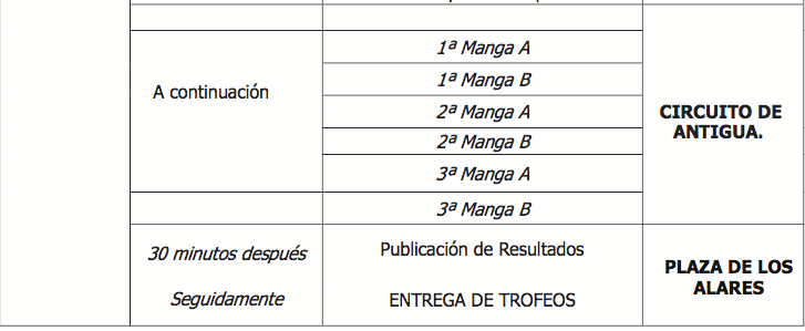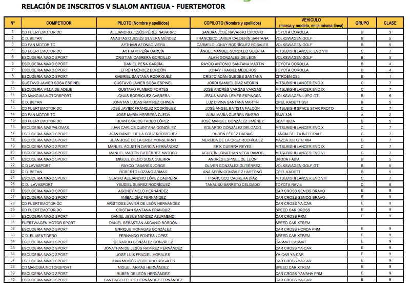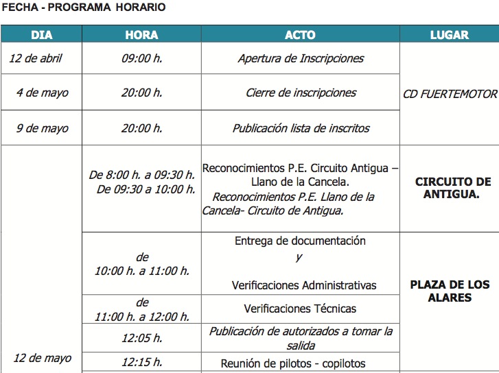 Siguiendo el Programa-horario de este V Slalom Antigua – FuerteMotor, el próximo 9 de mayo a las 20:00 h se publicará la lista de inscritos. Entre las 8:00 h y las 10:00 h del próximo sábado se realizarán los reconocimientos entre el Circuito de Antigua y la carretera anexa que formará parte del recorrido. A partir de ahí, entre las 10:00 h y las 12:15 h, la Plaza de los Alares (Antigua) acogerá las verificaciones administrativas y técnicas, la publicación de autorizados a tomar la salida y la reunión previa con los pilotos y copilotos participantes. Al filo de las 13:00 h está previsto el inicio de la competición, programada a tres mangas en cada sentido. Media hora después de la última prueba cronometrada, los participantes regresarán a la Plaza de los Alares para celebrar la entrega de trofeos.