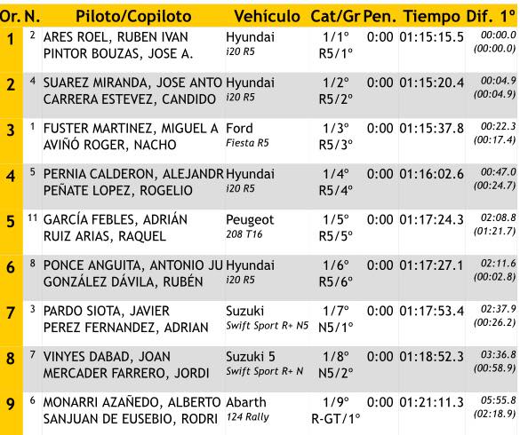 Los valencianos Miguel Fuster y Nacho Aviñó (Ford Fiesta R5) han perdido su segunda plaza con la que terminaban el viernes, encontrándose a 22.3 del liderato y 17.4 a de la segunda plaza pero con una cómoda renta respeto al cuarto lugar que ocupan el cántabro Surhayen Pernía y el grancanario Rogelio Peñate (Hyundai i20 R5), ganadores de la cuarta especial de la jornada, que están a 24.7 de los del Ford.