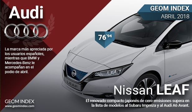 El fabricante de vehículos premium Audi se situó en el mes de abril como la marca más valorada por los internautas españoles según GEOM Index, el índice de referencia para el mercado automovilístico español que tiene en cuenta tanto la opinión de los usuarios en la red como la notoriedad que alcanzan los fabricantes. La firma alemana superó a otras firmas de origen germano, BMW y Mercedes-Benz, en un mes en el que las marcas de lujo tuvieron mayor protagonismo. La gran sorpresa se produjo en el apartado de modelos, ya que por primera vez en la historia del ranking de la consultora española un vehículo eléctrico se puso en cabeza. Se trata del nuevo Nissan Leaf, que aventajó en el balance final al Subaru Impreza y el Audi A6 Avant.