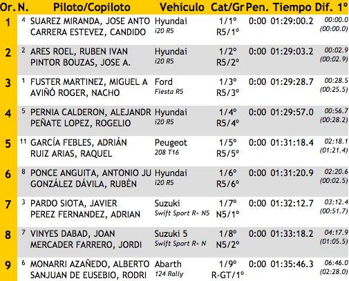Se acostaban Suárez y Carrera en la jornada del viernes en la tercera posición a 11.1 de los líderes, los gallegos Iván Ares y José A. Pintor (Hyundai i20 R5), y a 7.7 de los valencianos Miguel Fuster y Nacho Aviñó (Ford Fiesta R5), pero en los siete tramos que se celebraron este sábado fueron los más rápidos en cinco para llevarse el triunfo en la prueba del Campeonato de España, Canarias y Tenerife de Rallys de Asfalto con una renta de 2.9 sobre Ares y Pintor, que veían con impotencia como nada podían hacer para poder pararle en su remontada, y eso que en la última especial ambos equipos calcaban sus cronos.