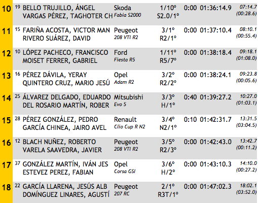 Fuster y Aviñó, que acabaron fuertes el viernes, perdían la segunda plaza y se tenían que ‘conformar’ con el último escalón del podio a 28.5 de la cabeza y a 25.5 del segundo lugar pero con una importante renta sobre los cuartos, el cántabro Surhayen Pernía y el grancanario Rogelio Peñate (Hyundai i20 R5), a 2.18.1 de los líderes y a 1:21.4 de la tercera plaza.