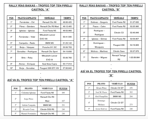 La segunda posición fue para otro piloto de Salceda, Jorge Pérez, que intentó sin éxito sumar su primera victoria absoluta teniendo que conformarse con la segunda posición, a pesar de intentarlo durante las cuatro especiales disputadas por la tarde. Cerraron el podio los hermanos Iglesias, que poco a poco se van encontrando más cómodos con su Ford Fiesta N5, y que se mantienen en el liderato del Trofeo Pirelli Castrol “A” por delante de Jorge Pérez y Adrián Campaña.