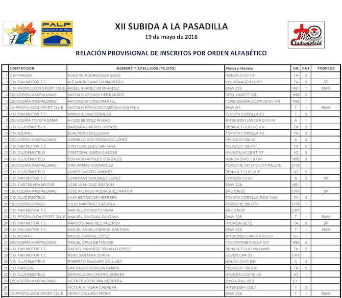 El Club Deportivo Cludemoteld hace pública la Lista provisional de inscritos de la XVII Subida a La Pasadilla, evento que se disputará noreste de Gran Canaria este sábado con un total de 48 equipos.