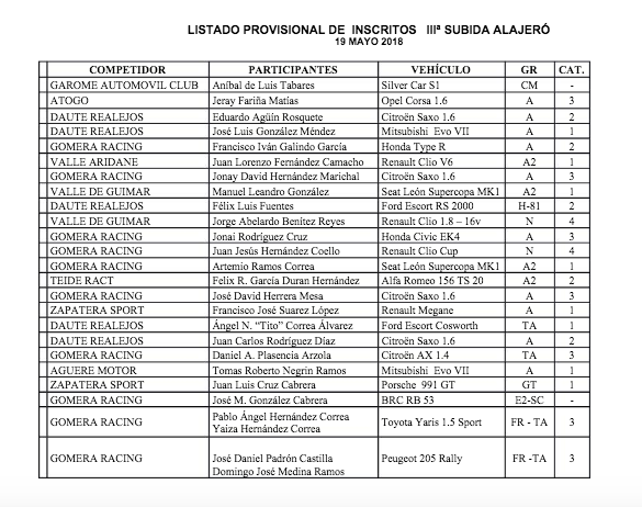 Publicamos el listado de inscritos provisional de la III Subida Alajeró que nos remite la Escudería La Gomera Racing de una prueba que se disputará este próximo sábado en la isla de La Gomera.