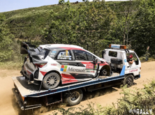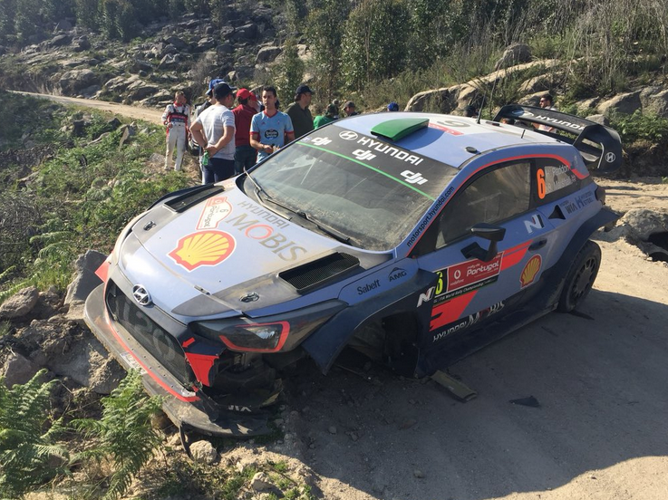 El Ford Fiesta de Sebastien Ogier se salió de la carretera hacia los árboles en una curva a izquierdas después de 17 km en la especial de Viana do Castelo. El copiloto Julien Ingrassia colocó rápidamente su triángulo de advertencia en el borde de la carretera antes de la curva, lo que indica que no continuarán.
