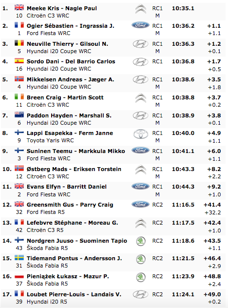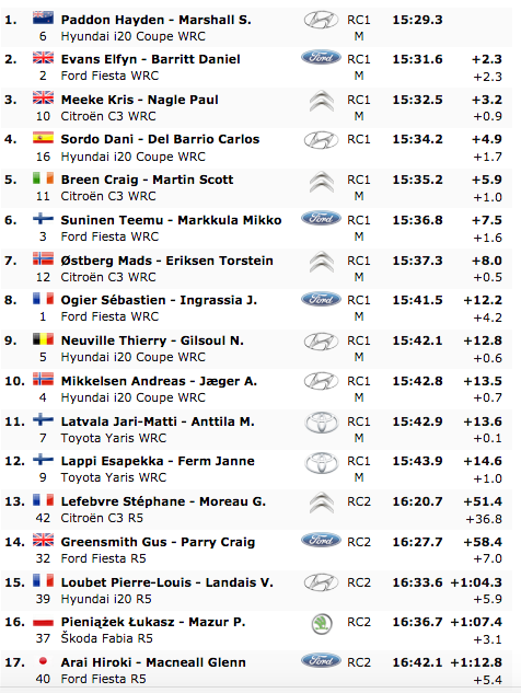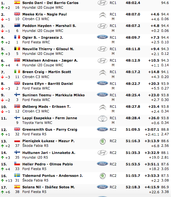 Un satisfecho Kris Meeke fue tercero, el británico comentó: «Es la primera vez con el Citroën C3 que me he sentido realmente como en casa». Está a 3,2 segundos del líder Paddon y fue 1,7 segundos más rápido que el Hyundai i20 de Dani Sordo.