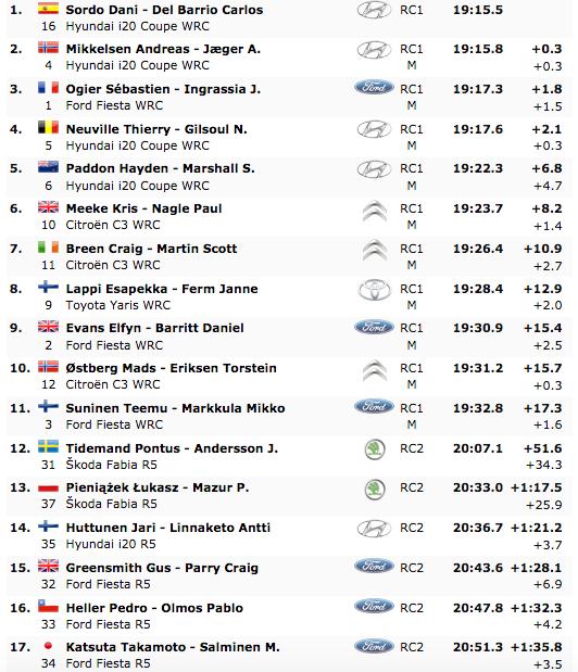 Su rival en el campeonato, Thierry Neuville, estaba pisándole los talones y se encuentra a 2.1 segundos de desventaja en el quinto lugar. El belga tuvo problemas para girar su i20 en las curvas, pero tiene una ventaja de 1.1 segundos sobre su compañero de equipo Andreas Mikkelsen.