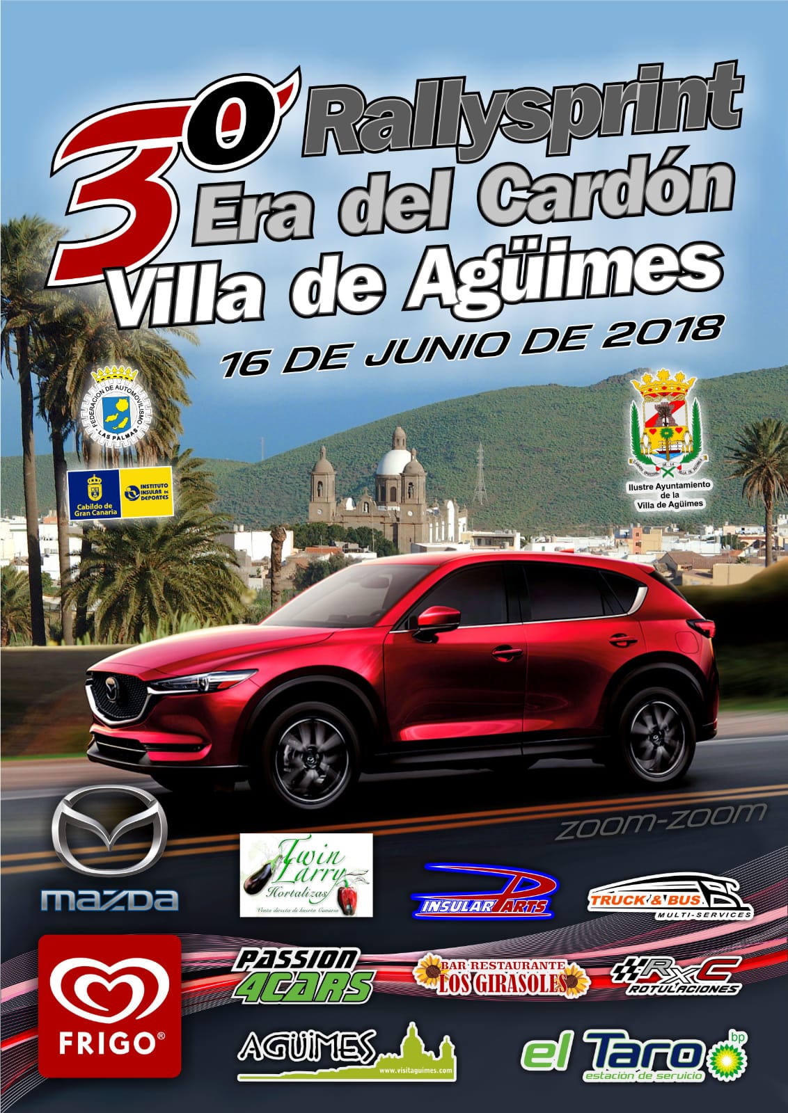 Agradecimiento muy especial también a las empresas que hacen posible esta prueba, como son: MAZDA, FRIGO, Ayuntamiento de Agüimes, bp el Taro, Twin Larry Hortalizas, Passion 4CARS, Insular Parts, Truck&Bus Multi – Services, Bar Restaurante Los Girasoles, Taller Chapa y Pintura Arencibia Team y RXC Rotulaciones.
