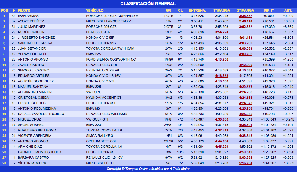 El piloto del Porsche superó en 10.561 al norteño Ayoze Benítez (Mitsubishi Lancer Evo VII), siendo tercero Julio Martínez (Porsche 996 GT3), que se quedó a 17.330 de la cabeza, a 6.769 del segundo puesto y superó a Rubén Padrón (Seat 600 JTR) en 1.337.