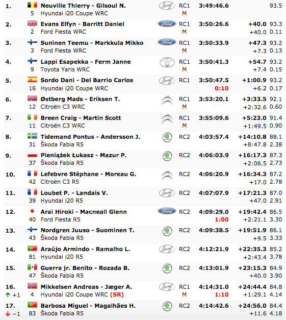 El británico Elfyn Evans terminó segundo con un Ford Fiesta, 7.3 segundos por delante de su compañero de equipo Teemu Suninen, quien anotó el primer podio de su carrera. Ogier se quedó sin puntos en un rallye que lastró a muchos de los favoritos.