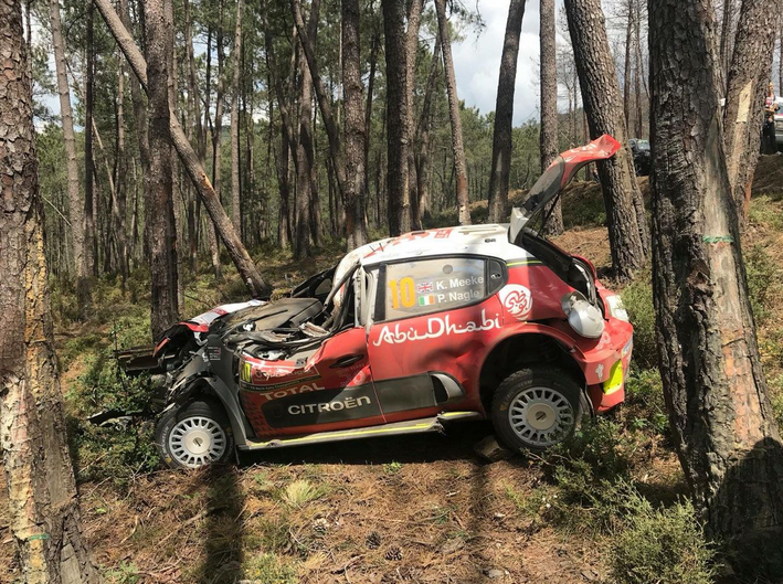 La actuación de Kris Meeke en el Vodafone Rally Portugal 2018 ha estado marcada por los fuertes desperfectos que le ocasionó al Citroën C3 WRC tanto en el sexto tramo como en el décimo segundo, donde dejó la unidad del equipo galo seriamente dañada.