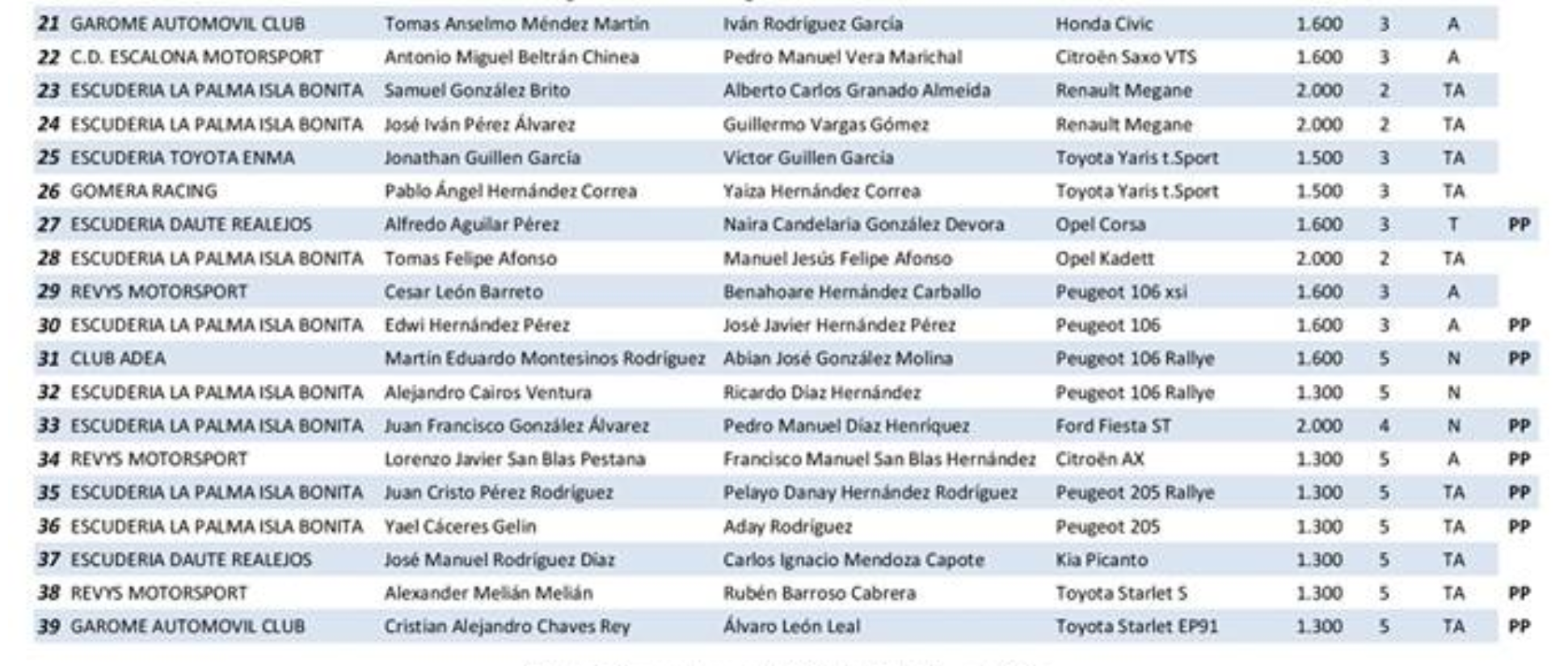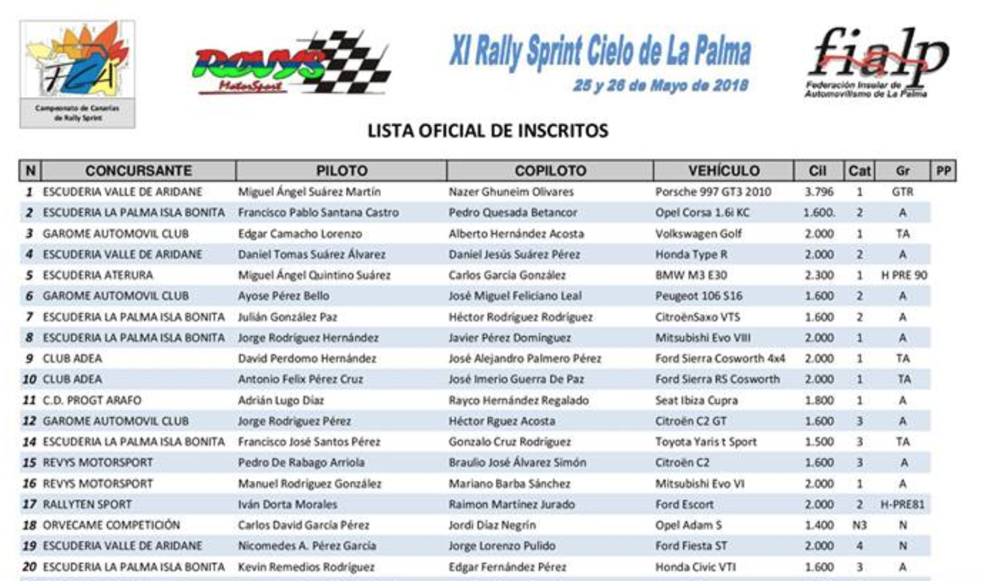 Lista de inscritos del Rallyesprint Cielo de La Palma: