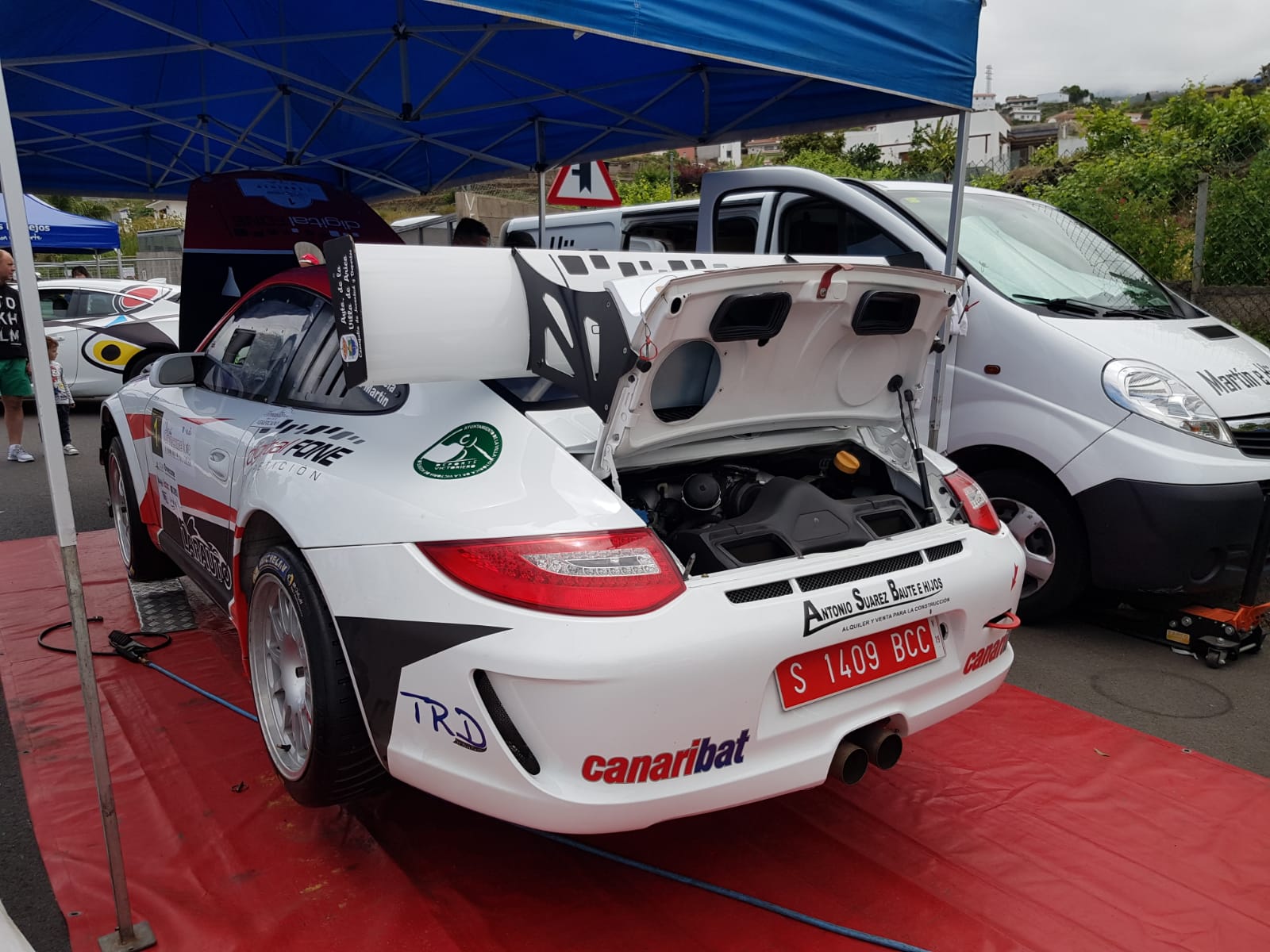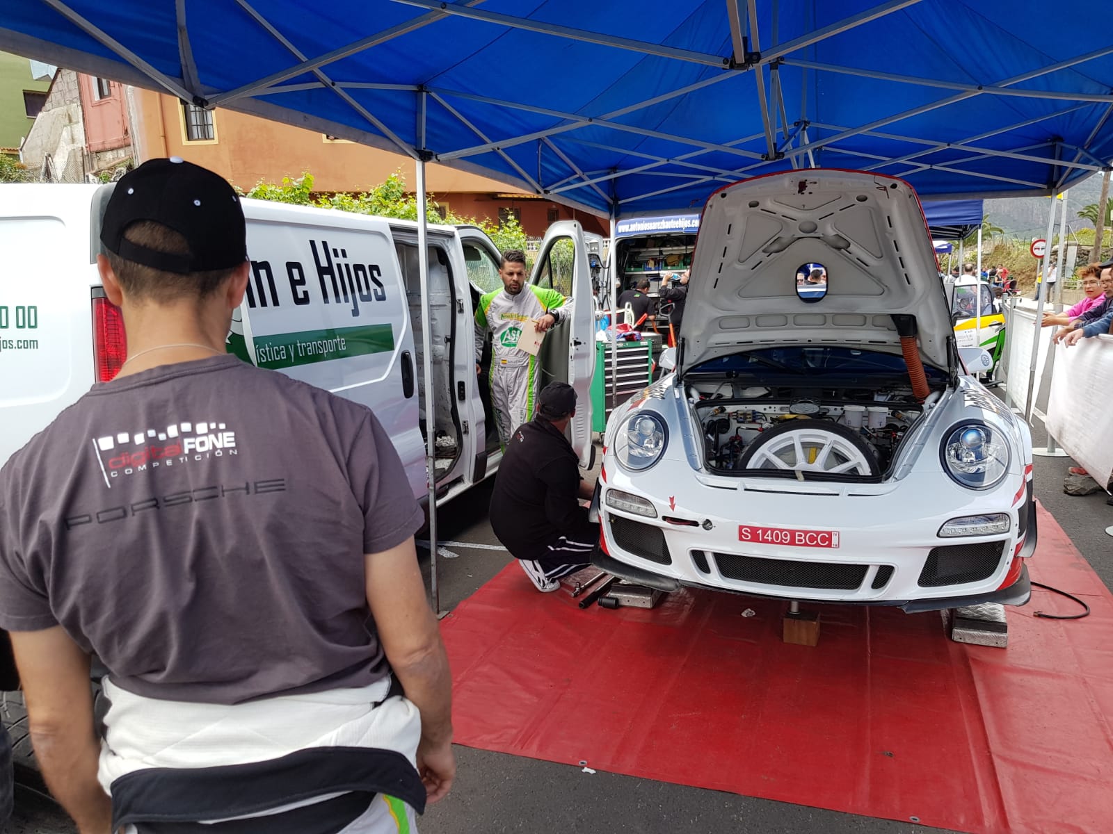 Actuales campeones tinerfeños, los del Porsche 997 GT3 2010 comenzaron desde primera hora de la mañana a marcar el ritmo. Después de los cuatro primeros tramos celebrados contaban en su haber con cuatro mejores tiempos y cerca de 50 segundos de ventaja sobre su más inmediato perseguidor. Los de Digital Fone Comunicaciones, TabacoBarato.com, Antonio Suárez Baute e Hijos, Ayuntamiento de Arico, Canaribat y Autoservicio Larauto le tomaron rápidamente el pulso a los nuevos neumáticos de la temporada 2018 y estaban defendiendo su condición de campeones con pleno acierto.