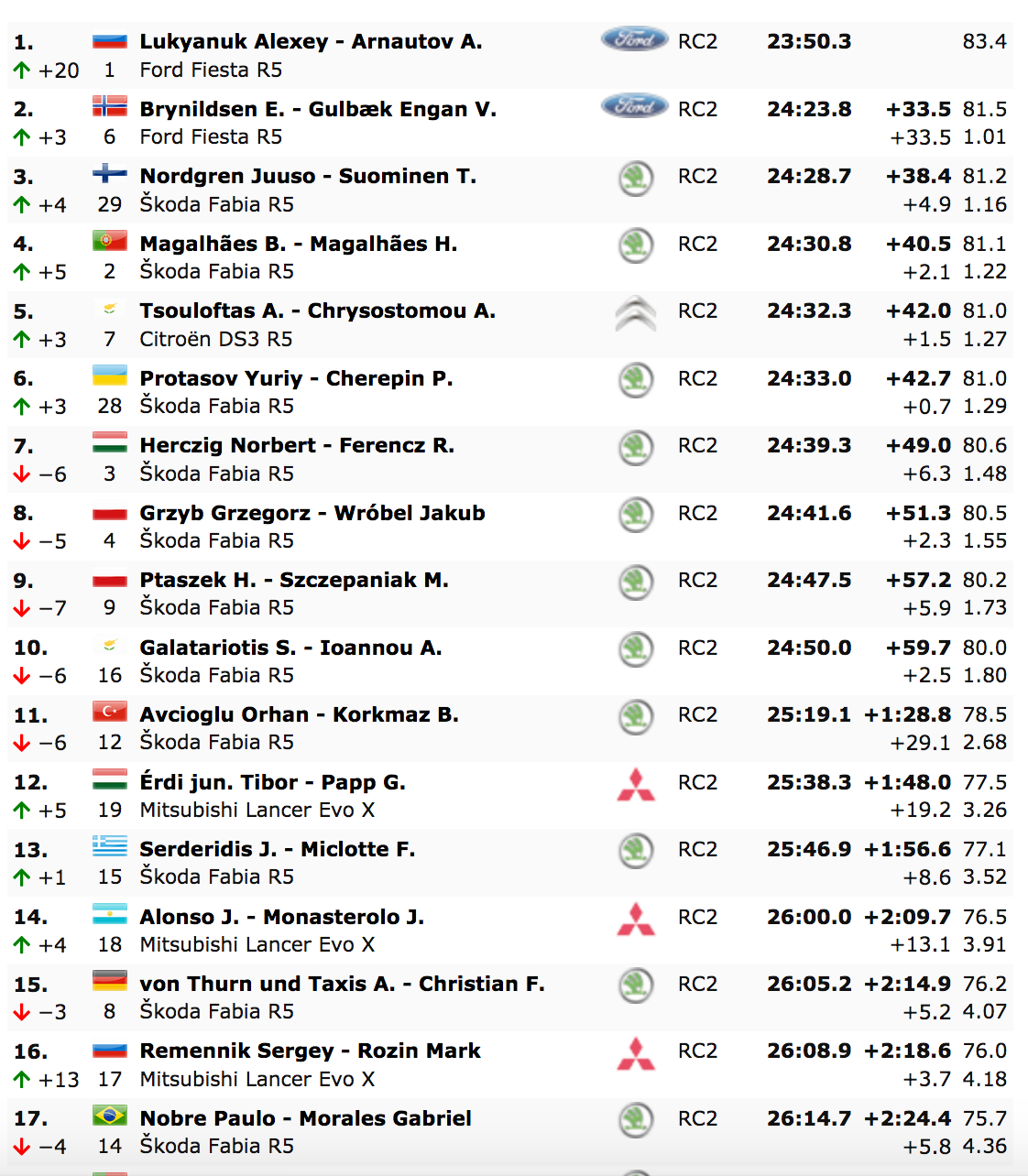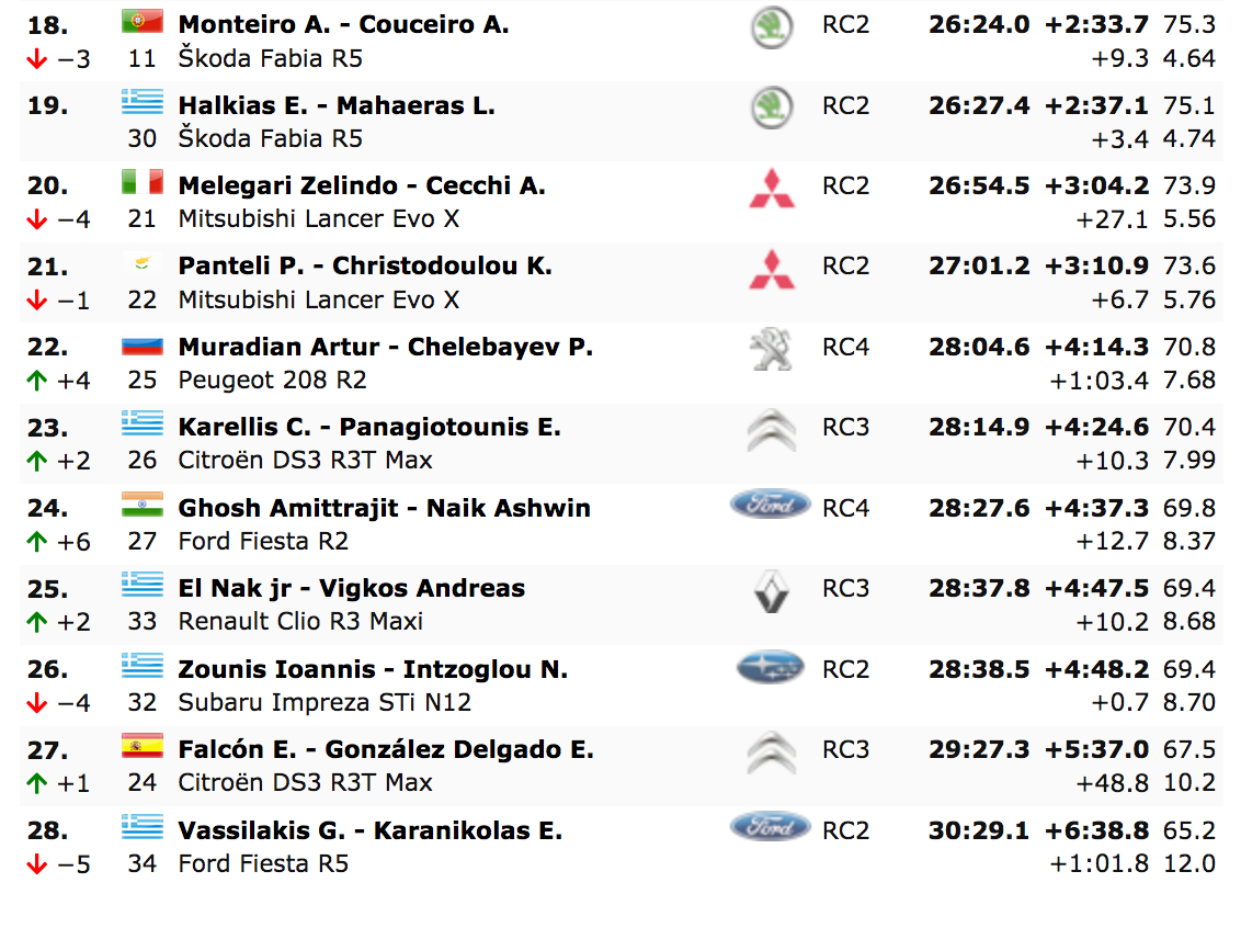 Tras haber sufrido un pinchazo en la ES1, Lukyanuk había perdido 12 segundos ante el líder Norbert Herczig en la prueba de Thiva, de 30 kilómetros, pero se recuperó con una victoria en la ES2, 44.5 segundos más rápido que Eyvind Brynildsen, para pasar a ocupar el primer lugar. «Es una gran sorpresa, cometí algunos errores», dijo Lukyanuk al final de Thiva. «El camino estaba realmente limpio para nosotros, mejor que para los muchachos que venía detrás Pero perdimos muchos segundos y necesitábamos recuperar algo de tiempo en las siguientes especiales», resumió.