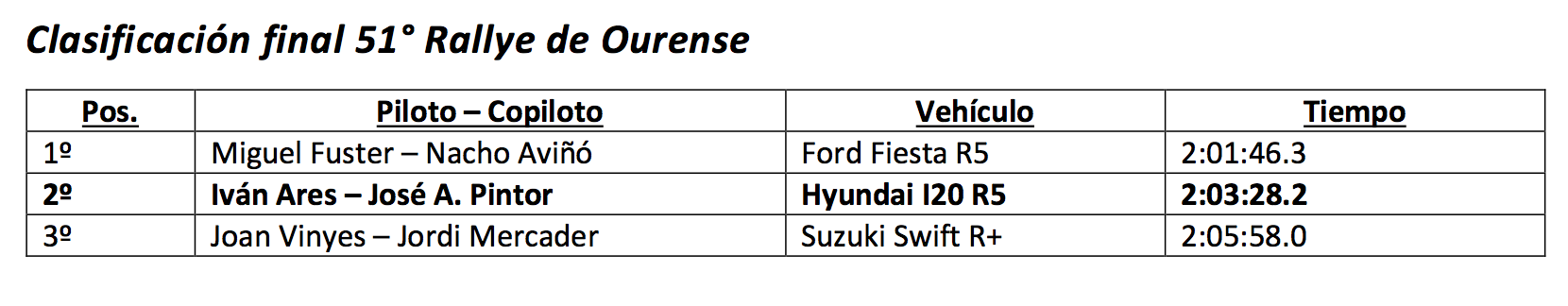 «Me gustaría dar la enhorabuena a Santiago García y a Nestor Casal por el gran rallye que han hecho con el Peugeot 208 R2 de nuestro equipo, en su debut a nivel nacional y en el Rallye de Ourense más complicado que recuerdo. Han logrado ser una de las sorpresas de la prueba. También quiero mandar muchos ánimos a dos compañeros de marca, como son Shurayen Pernía y Carlos Vieira, que este fin de semana sufrieron sendos accidentes. En el caso de Carlos espero que pronto pueda estar subido de nuevo en un backet, mientras que a Pernía tengo seguro que volverá a dar mucha guerra en Ferrol dentro de un mes”, sentenció Ares.