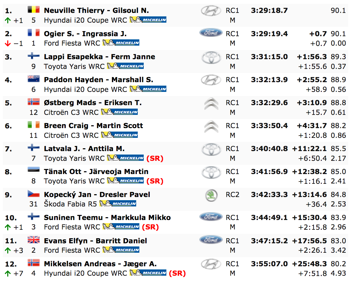 Los resultados siguen siendo provisionales después de un incidente extraño al final de la penúltima especial, cuando Ogier se fue apresuradamente con su Ford Fiesta sin recoger su carnet de ruta. Luego fue entregado por Ott Tänak y se espera noticias sobre si Ogier recibirá una penalización.