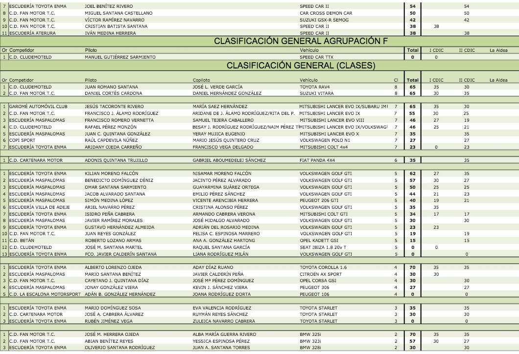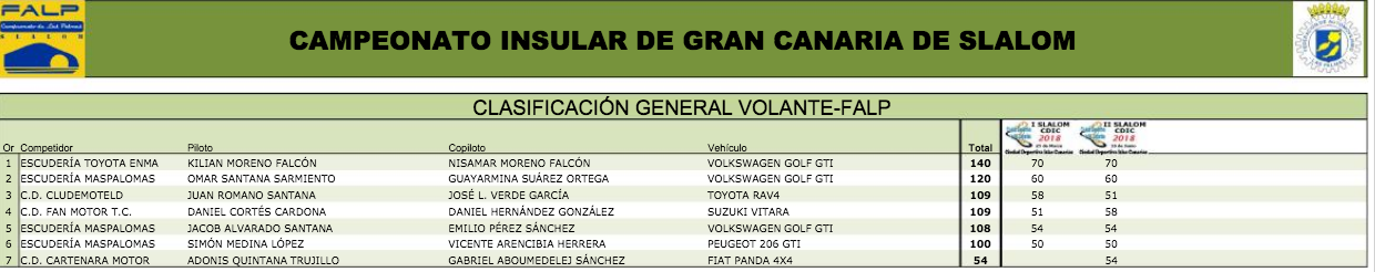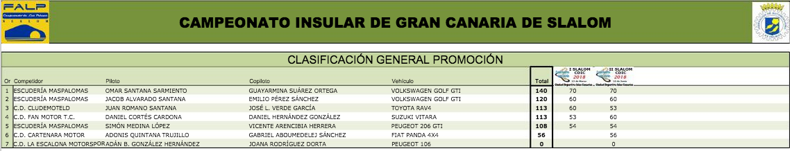El segundo puesto obtenido por el espectacular Subaru Impreza de Jesús Tacoronte-María Sáez, junto a su victoria del pasado mes de marzo en este mismo trazado, les mantiene como líderes del certamen, empatados a una victoria con los vencedores de este segundo slaloms, Juan Carlos Quintana-Yeray Mujica, que llevaron su Mitsubishi Lancer Evo X al triunfo en la competida jornada vivida en el recinto teldense, con una gran afluencia de aficionados.