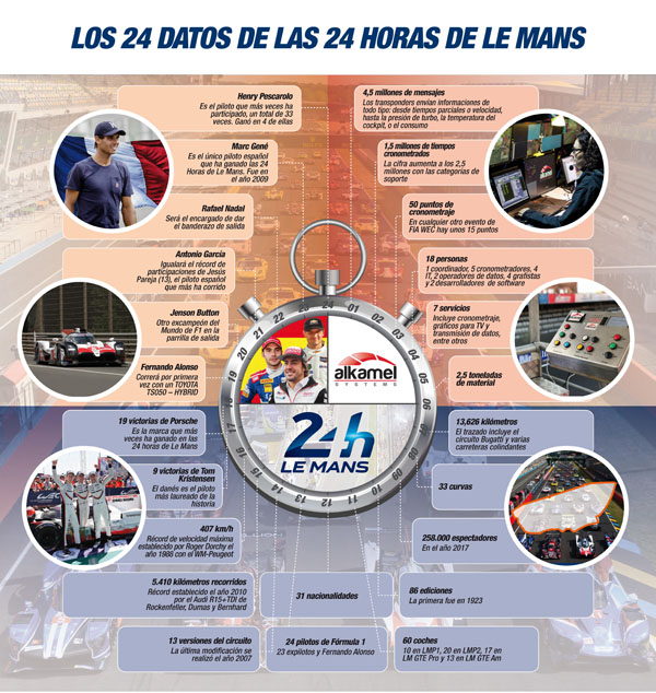 En su 86ª edición, las 24 Horas de Le Mans, segunda prueba del calendario del FIA WEC, hablarán más español que nunca. A la presencia de Al Kamel se suma este año una de excepción, la de Fernando Alonso, bicampeón del mundo de Fórmula 1, quien a sus 36 años competirá por primera vez en la cita gala al volante de un Toyota TS050 Hybrid, en LMP1. También repetirán Antonio García y Miguel Molina. El madrileño, con tres triunfos en su categoría, afrontará su decimotercera participación, mientras que para el gerundense ésta será su segunda experiencia. Además, en este 2018 también será un español quien dé el banderazo de salida: el once veces campeón de Roland Garros, Rafa Nadal.