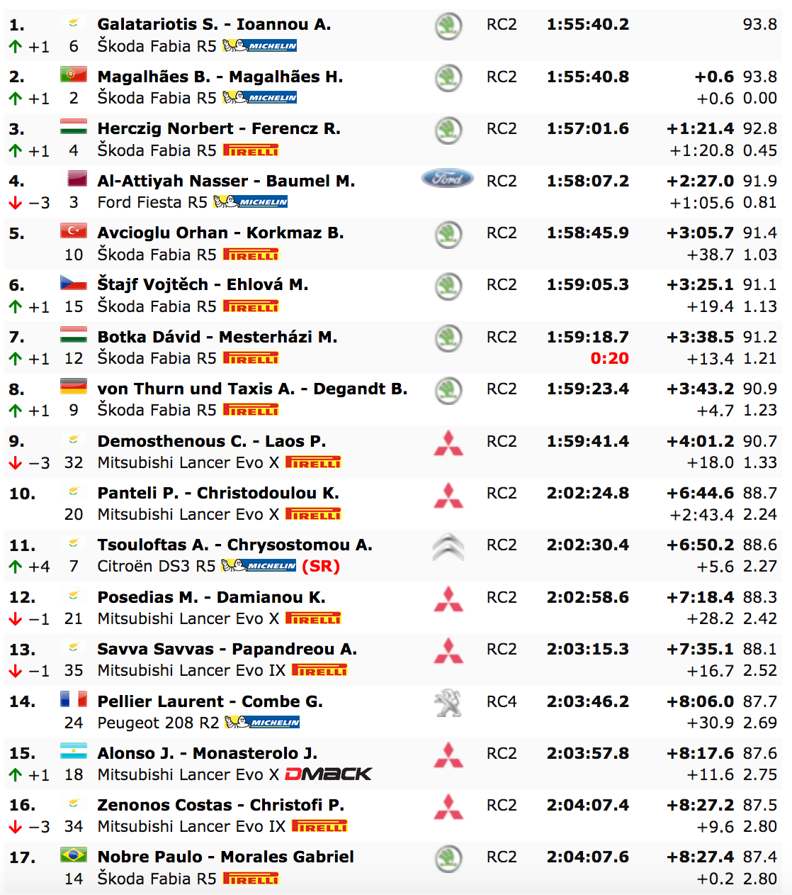 Norbert Herczig ascendió a un sorprendente segundo podio consecutivo por el retraso de Al-Attiyah, terminando 1:21.4 por detrás de Galatariotis a bordo de su Škoda Fabia R5 del MOL Racing Team.