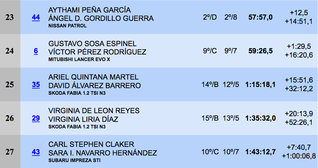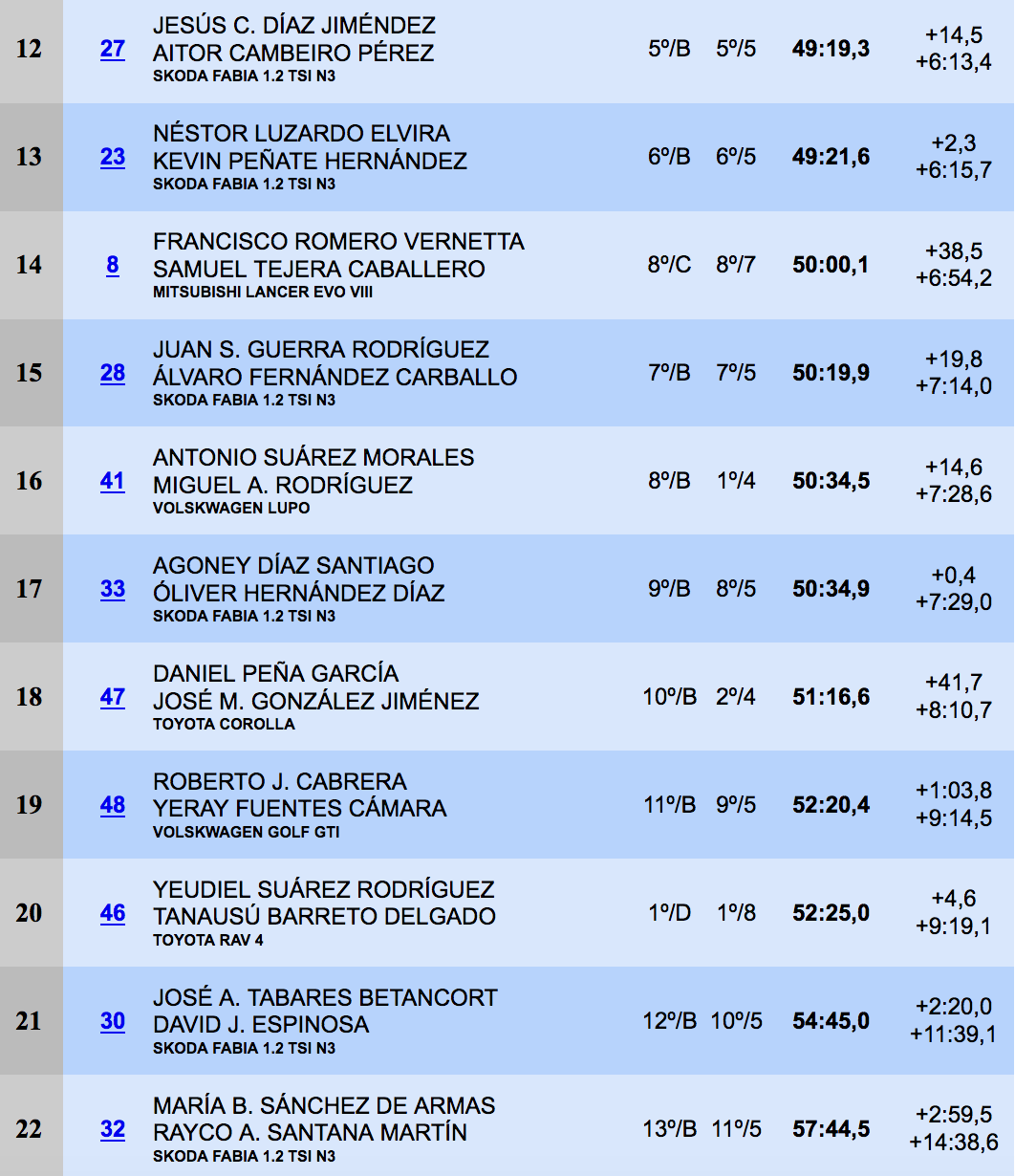 Terceros y mucho más lejos de los anteriores fueron Javier Fránquiz y Pedro Domínguez (Mitsubishi Lancer Evo IX), que se quedaban a 1:26.1, siendo cuartos Kevin Guerra y Dani Sosa, que le sacaron todo lo que llevaba al Skoda Fabia 1.2 TSI N3 para superar a monturas mucho más potentes.