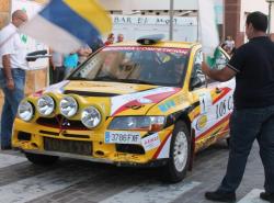 El concejal de Deportes del Ayuntamiento de Antigua, Fernando Estupiñán felicita la actuación de los pilotos de Antigua, Manuel A. García (Nolito) y Tecorice Hernández (conocido como Teco) que con su Mitsubishi Lancer Evo IX lograron la victoria en el XX Rally Puerto del Rosario, celebrado el pasado fin de semana.