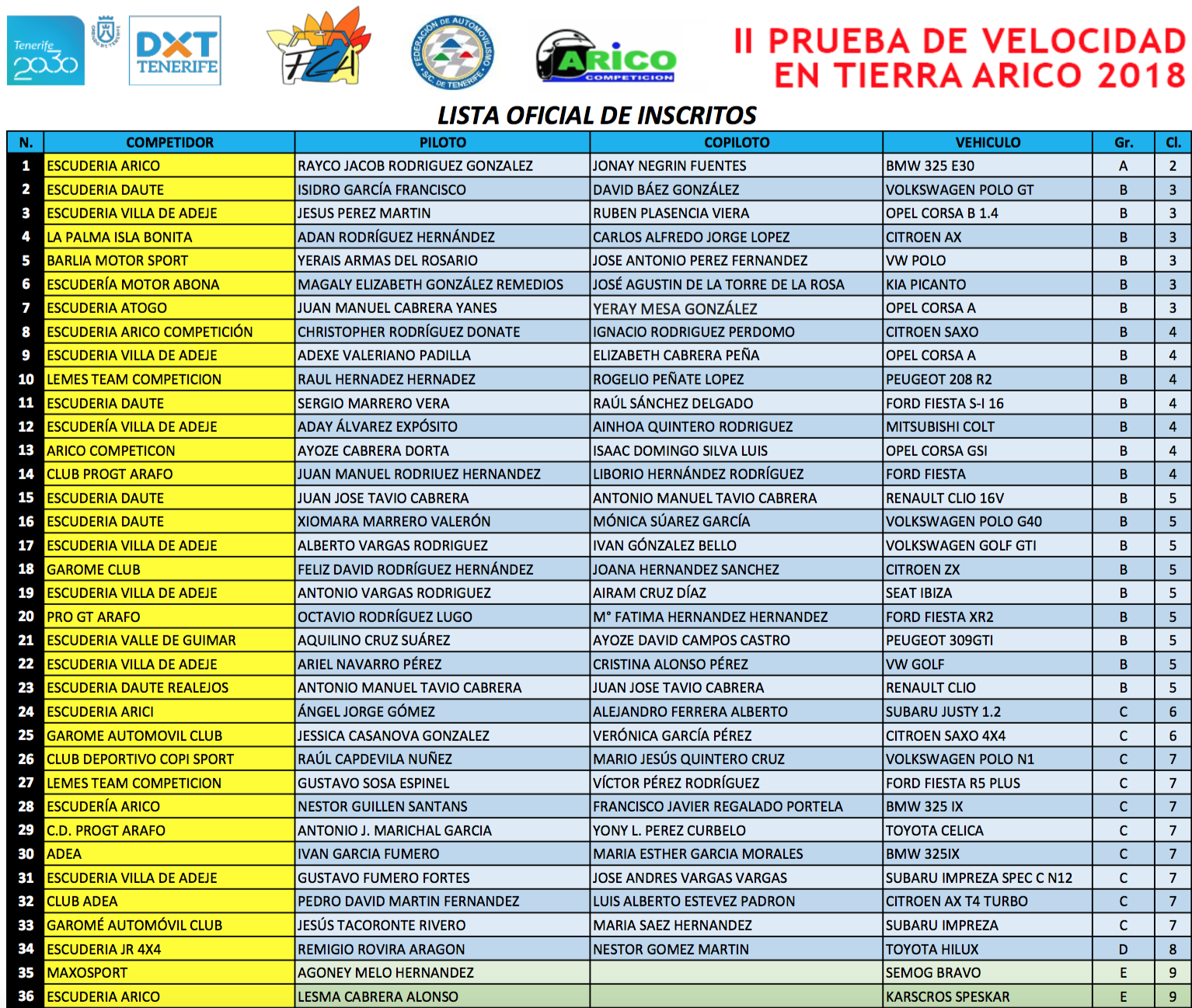 Publicamos las lista oficial de inscritos del II Slalom Arico 2018, prueba que se celebrará este fin de semana en el sur de la isla de Tenerife.