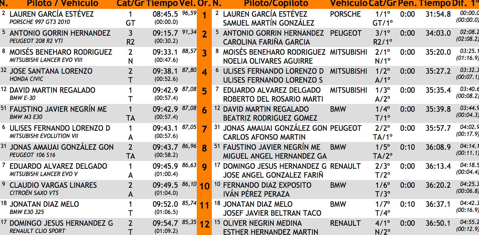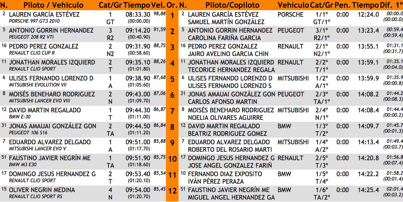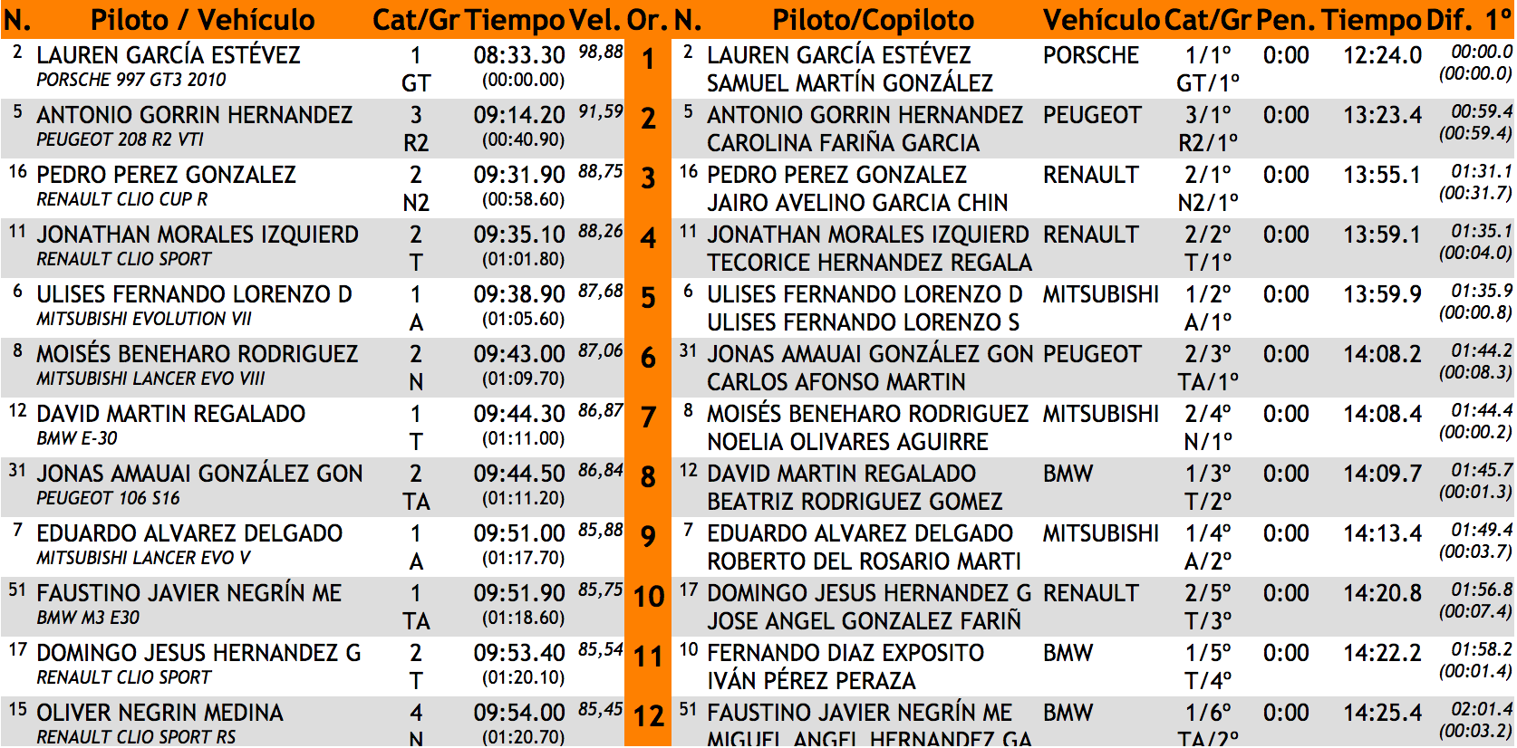 La sorpresa agradable del inicio de la cita tinerfeña está en el nivel que están mostrando Toni Gorrín y Carolina Fariña, que llevan su Peugeot 206 R2 a la segunda posición de la general, siendo terceros Pedro Pérez y Jairo Avelino (Renault Clio Cup R), que está a 31.7 del segundo puesto y superando en solo 4.0 a Jonathan Morales y Tecorice Hernández (Renault Clio Sport), que tienen a 0.8, en la quinta plaza, a Ulises Fernando Lorenzo, padre e hijo, en el Mitsubishi Lancer Evo VII.