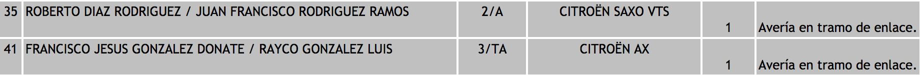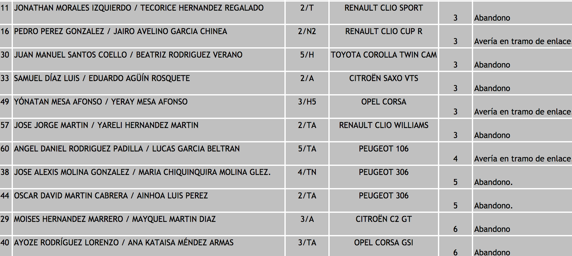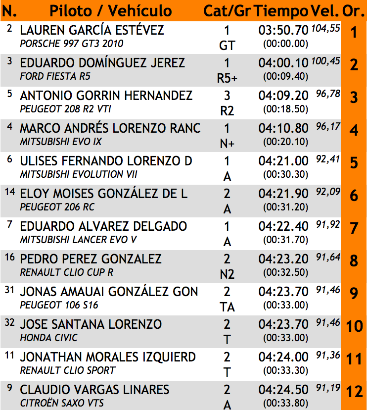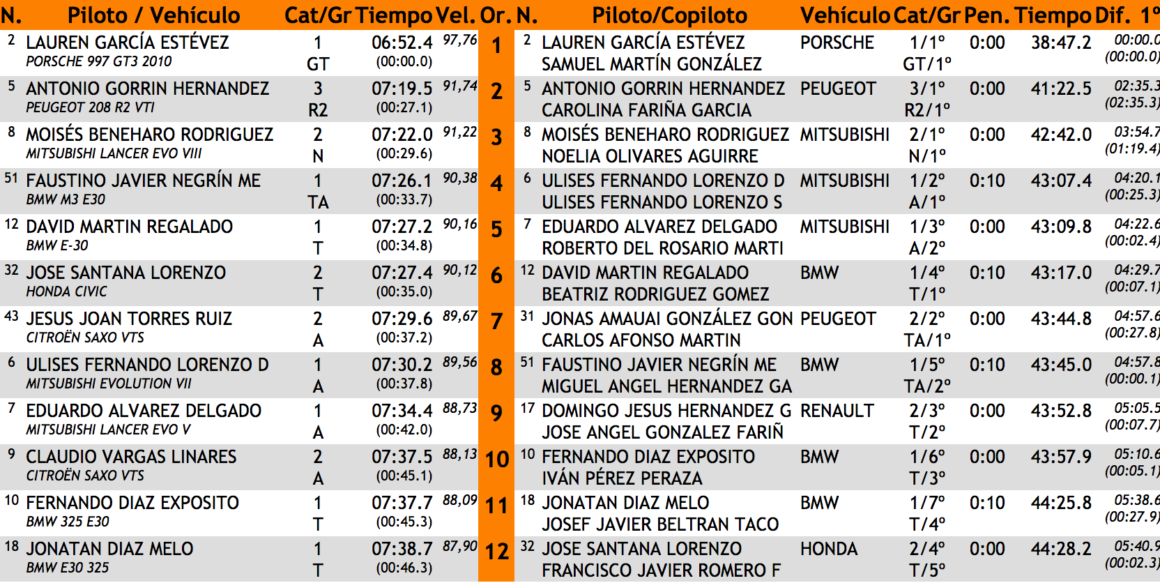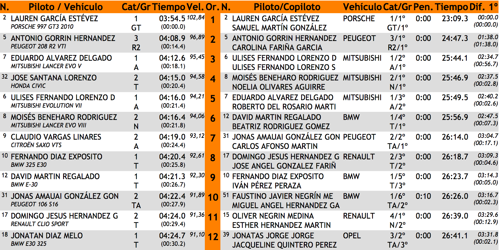 La sorpresa agradable del inicio de la cita tinerfeña está en el nivel que están mostrando Toni Gorrín y Carolina Fariña, que llevan su Peugeot 206 R2 a la segunda posición de la general, siendo terceros Pedro Pérez y Jairo Avelino (Renault Clio Cup R), que está a 31.7 del segundo puesto y superando en solo 4.0 a Jonathan Morales y Tecorice Hernández (Renault Clio Sport), que tienen a 0.8, en la quinta plaza, a Ulises Fernando Lorenzo, padre e hijo, en el Mitsubishi Lancer Evo VII.