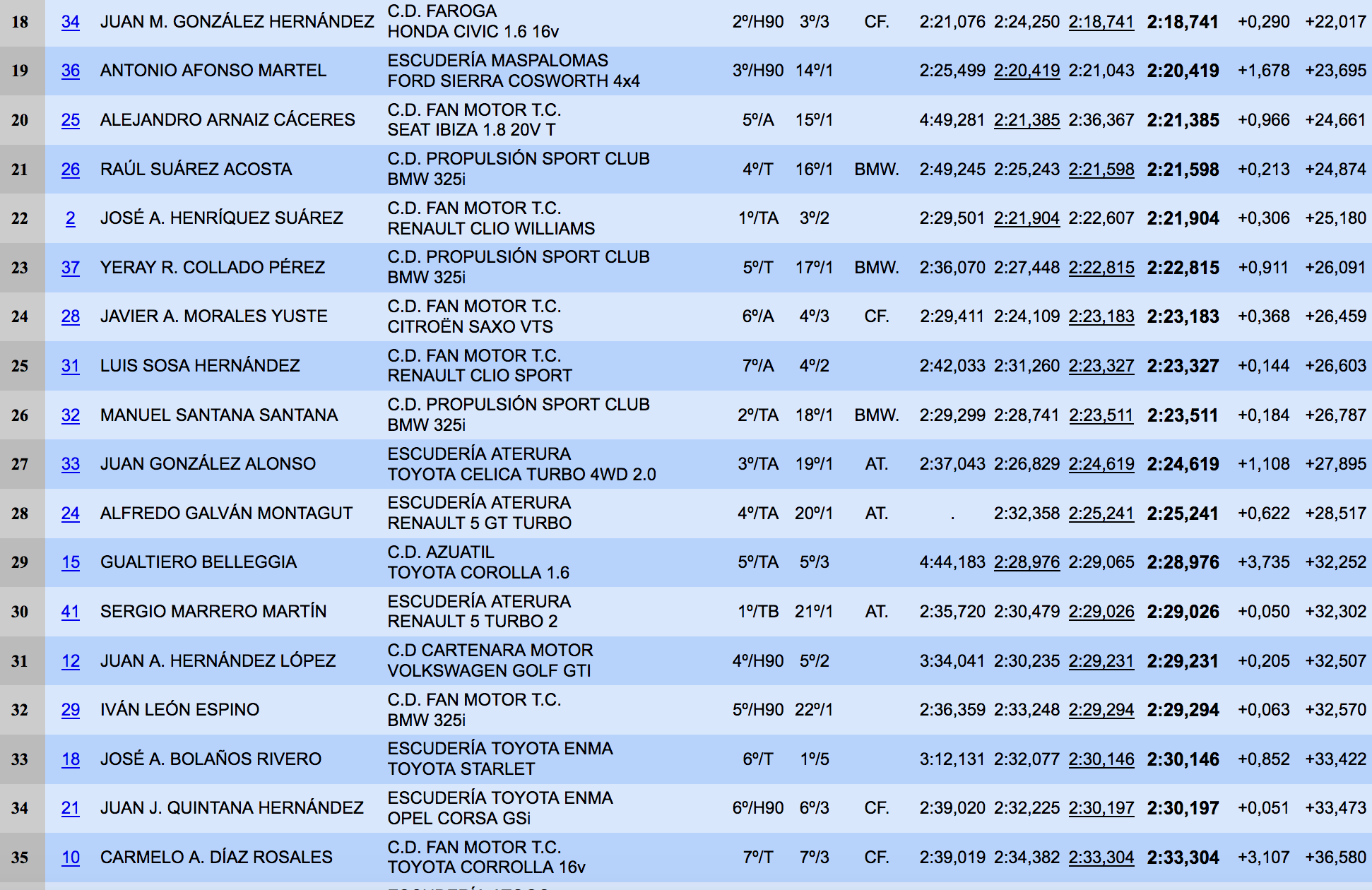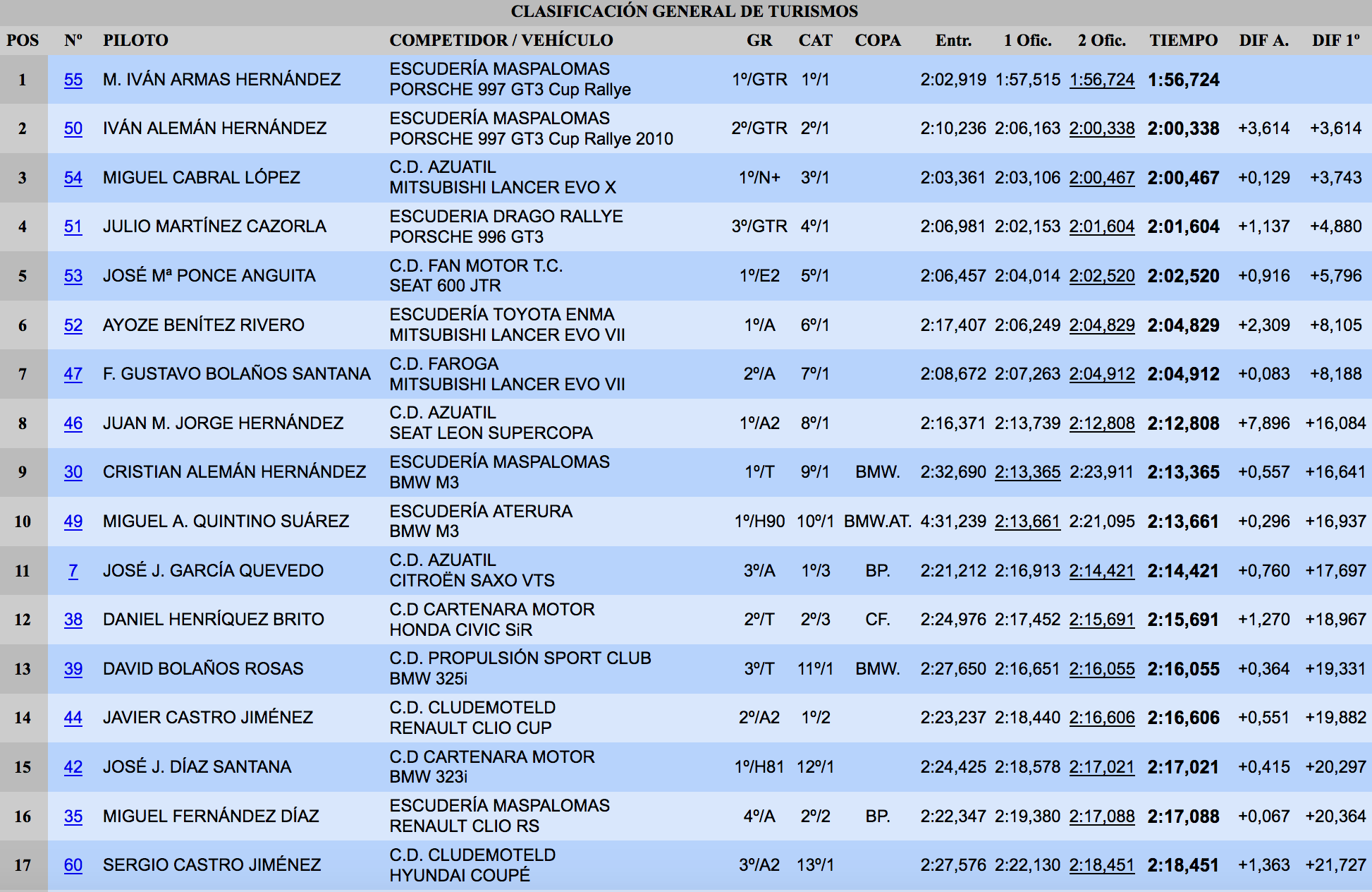 Cristian Alemán, pilotando un BMW M3, se anotó la Copa BMW Power desde la séptima posición, además de ganar el Grupo T. A su espalda dejó, completando el top ten, el BMW M3 de Miguel Quintino, primer clasificado entre los ‘H’ previos al año 90. Un sorprendente José García, al volante de un Citroën Saxo, conquistó el Trofeo BP de Promoción y la Categoría 3. Por otro lado, la Copa Faroga fue para el Honda Civic de Daniel Henríquez.