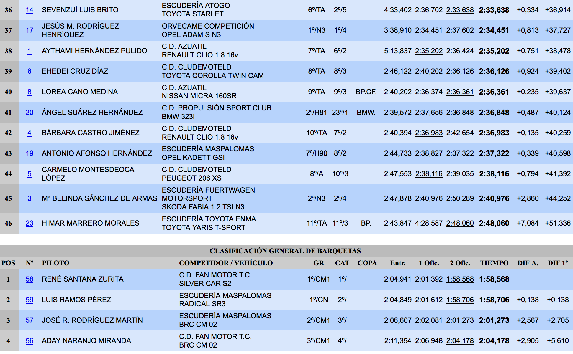 En el apartado de Barquetas los aficionados tuvieron que esperar al último segundo para conocer al vencedor de esta edición de la Subida de Arucas. René Santana y su Silver Car S2 pararon el cronómetro en 1:58.568, por el 1:58.706 de la Radical SR3 de Luis Ramos, es decir, apenas 138 milésimas de diferencia entre ambos. El podio lo completó la BRC CM 02 de José Rodríguez, a algo más de dos segundos de los más rápidos.