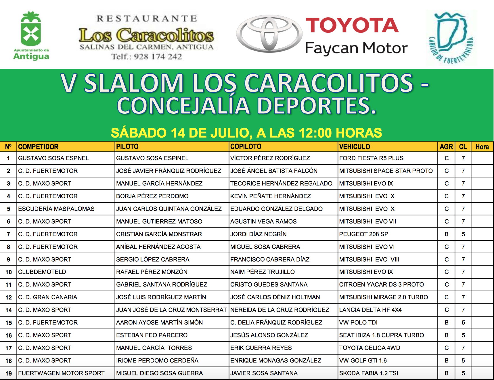 La V edición del Slalom de los Caracolitos, prueba que se celebrará este próximo sábado 14 en la isla de Fuerteventura, más concretamente en el Barranco de las Salinas del Carmen, será valedera para el Campeonato Provincial de Las Palmas de Slaloms y tiene una lista de inscritos compuesta por un total de 38 equipos participantes, de los que 28 son del apartado de Turismos y 9 Car cross.