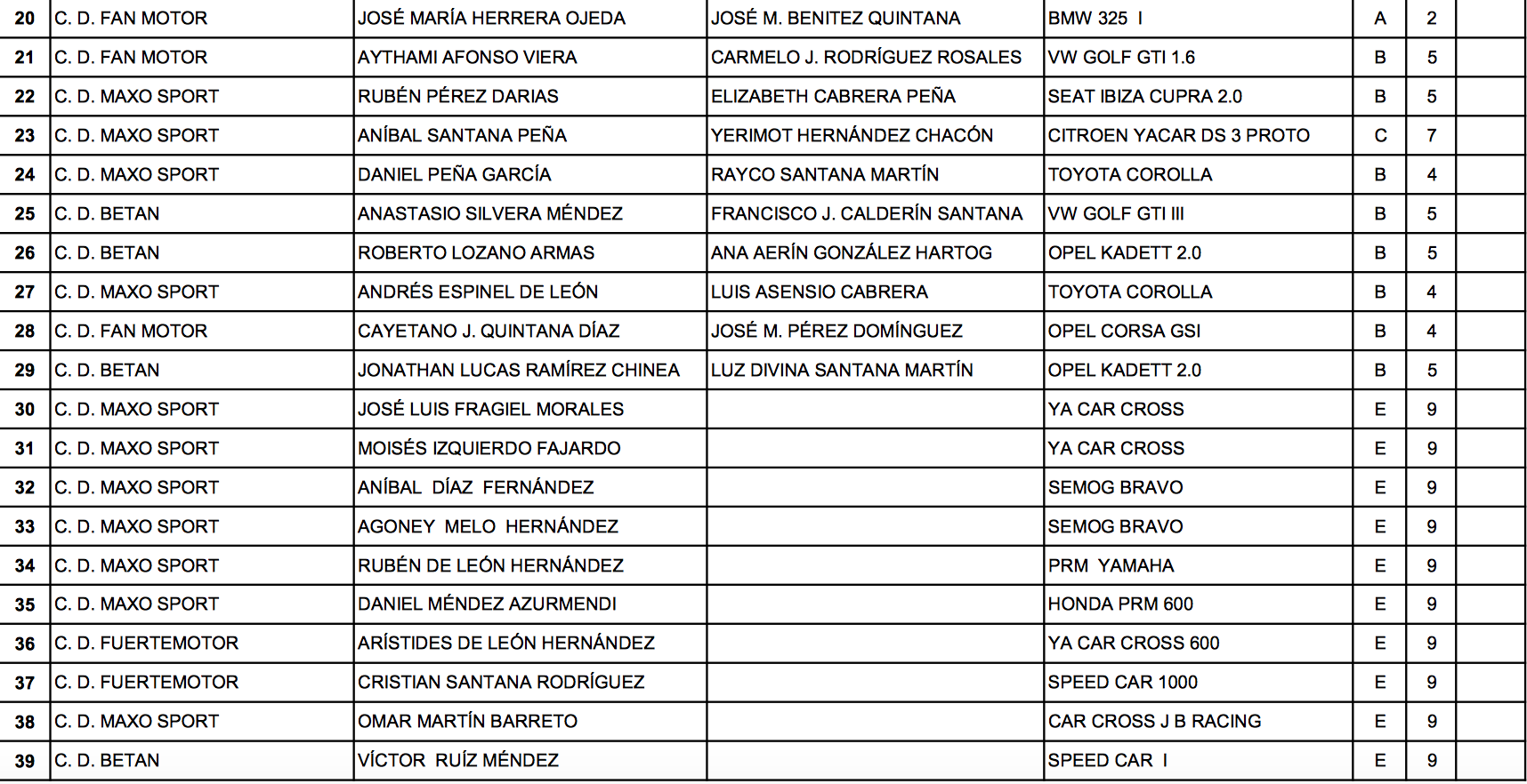 Espectacular lista donde están algunos pilotos habituales del Campeonato de España de Rallys. El mejorero Gustavo Sosa (Ford Fiesta R5) saldrá con el número uno, seguido por sus paisanos Javier Fránquiz (Mitsubishi Space Star Proto), Nolito Garcia (Mitsubishi Lancer Evo IX), Borja Pérez (Mitsubishi Lancer Evo IX), el grancanario Juan Carlos Quintana (Mitsubishi Lancer Evo X), campeón de Canarias y de España de Grupo N, Manuel Gutirrez (Mitsubishi Lancer Evo VIII), el Campeón de España de Rallys de Asfalto 2016, el zaragozano Cristian Garcia, que pilotará un Peugeot 208 N5 adquirido por MRT al preparador leonés RMC, Anibal Hernandez (Mitsubishi Lancer Evo VI) y Sergio López (Mitsubishi Lancer Evo VIII), entre otros. Lo dicho, nivelazo. Y si no lo tienen claro, miren la lista de inscritros…