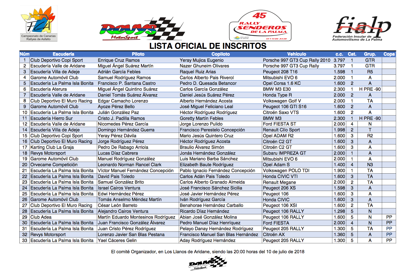 Publicamos la Lista de inscritos del Rally Senderos de La Palma, prueba del Campeonato de Canarias de Rallys que se disputará este próximo sábado.