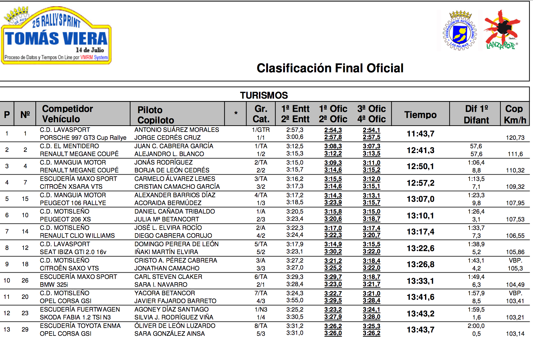 Al final fueron 27 equipos los clasificados en este Rallysprint Tomás Viera-Tinajo, con nueve retirados todos por averías mecánicas y de los cuales cuatro lograron continuar reenganchados tras solucionar los problemas técnicos. Destacar la mala suerte de Suso Lemes, abonado a las plazas de podio al estar siempre metido en ellas en esta carrera, pero un pinchazo en la segunda de las cuatro mangas oficiales le cambió los planes al perder siete minutos y hundirse en la clasificación final.