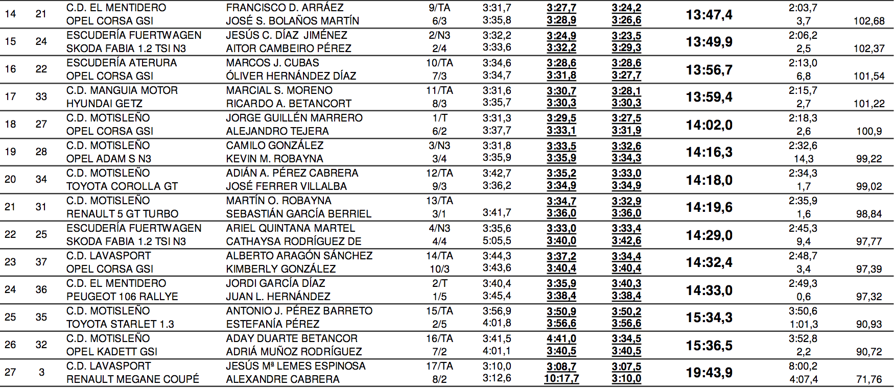 Agoney Diaz y Silvia Rodríguez vencían dentro de la categoría 4 y el grupo N3 con su Skoda Fabia Copa. Jordi García y Juan Luis Hernández ganaban la categoría 5 con un Peugeot 106 Rallye. Y José Guillen-Alejandro Tejera con un Opel Corsa fueron los mejores del grupo T.