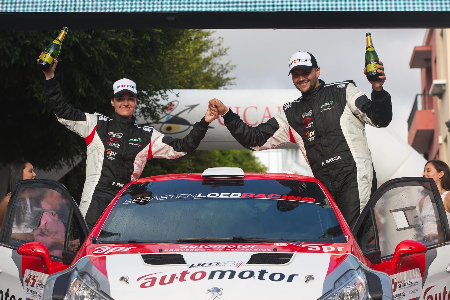 Miguel Suárez y Nazer Ghuneim con un tiempo de 59:55.1 se proclamaron segundos con su Porsche 997 GT3, tras pagar el precio de los primeros tramos de exigencia del Senderos. A escasos segundos con un crono de 1:01:38.7 entraron terceros Adrián García y Raquel Ruiz en su debut en Canarias con el Peugeot 208 T16 R5.