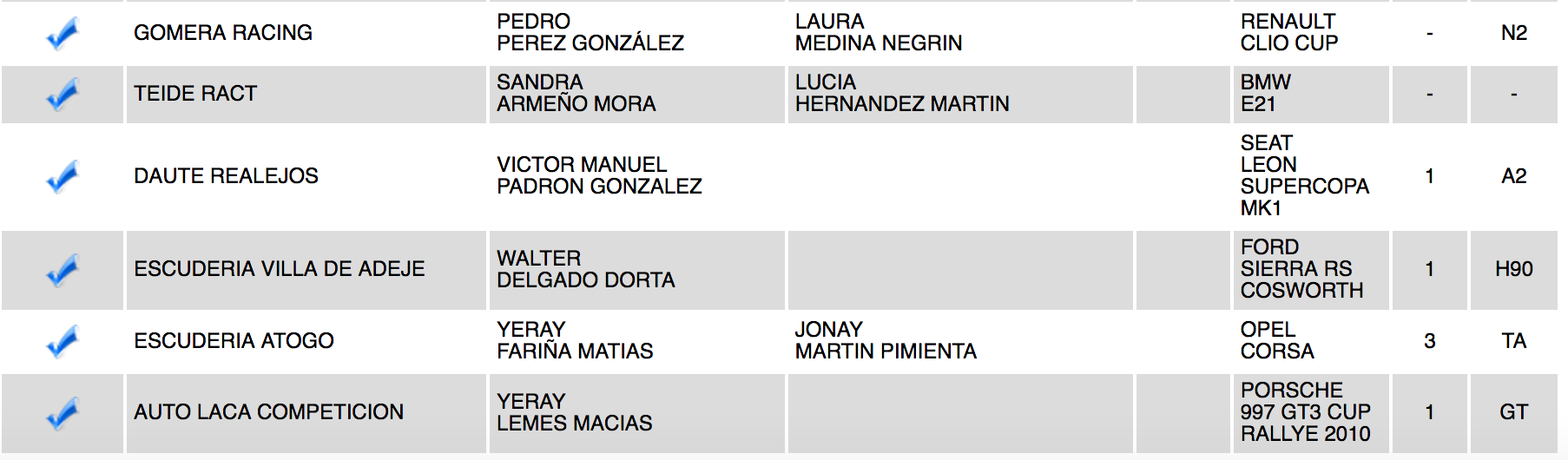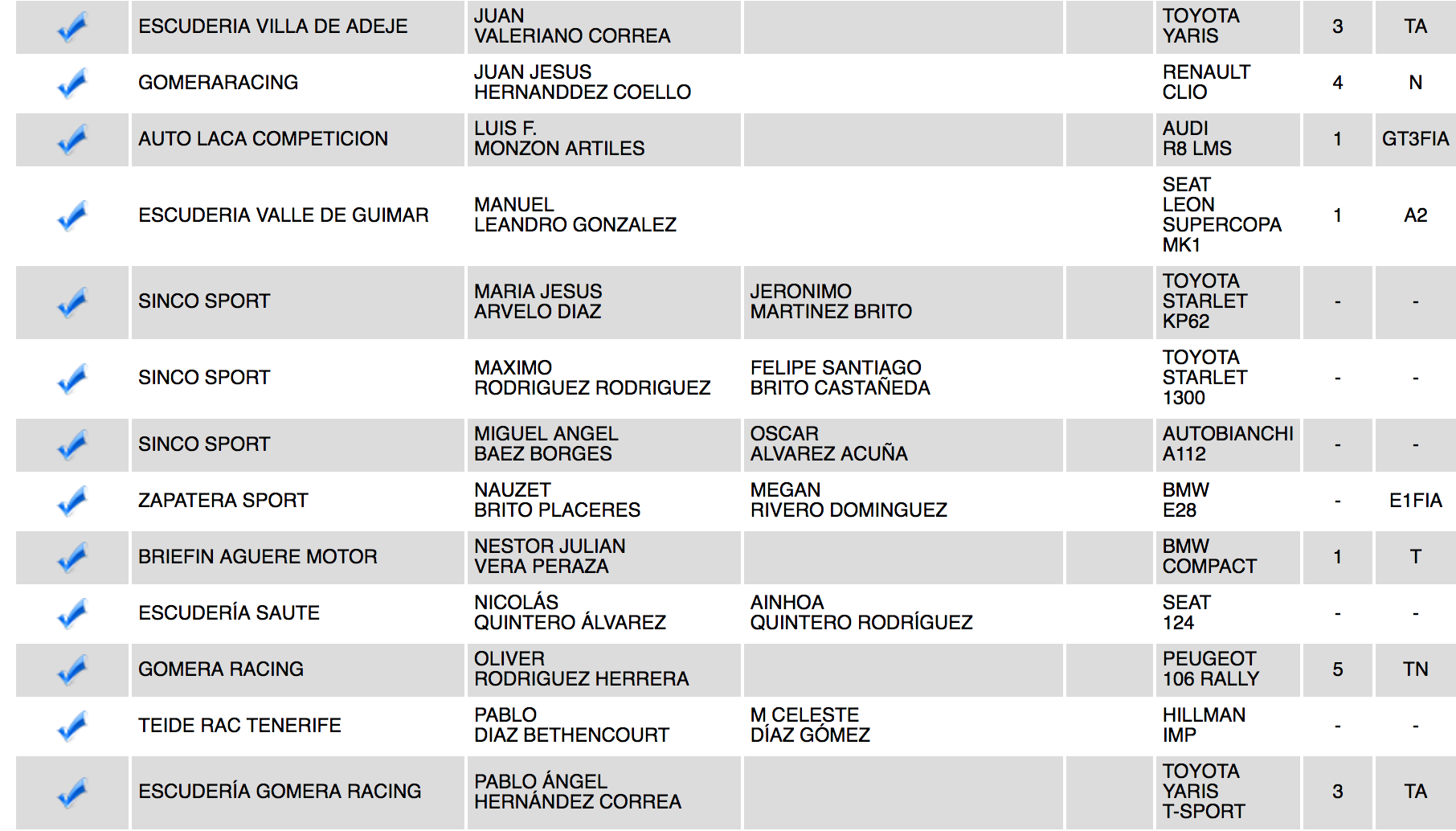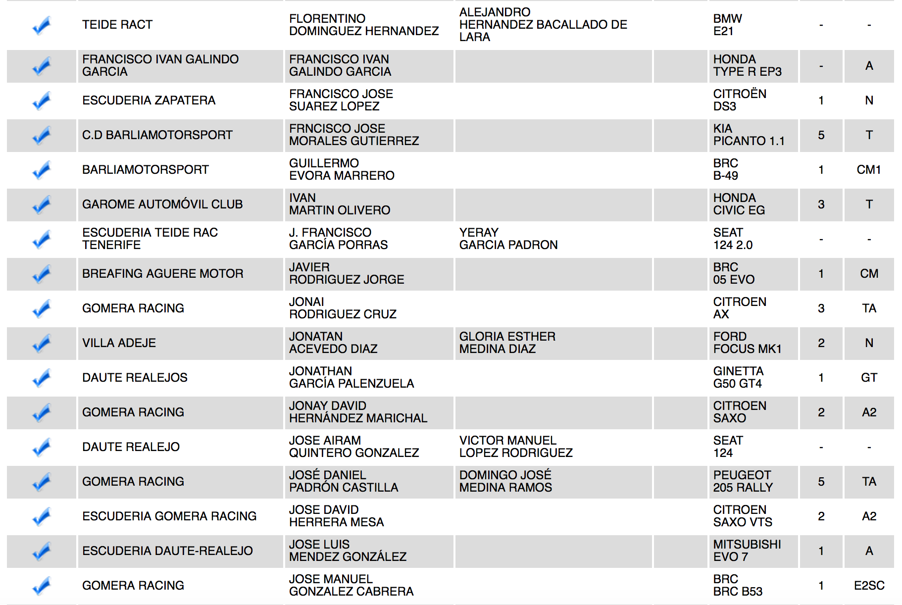 Entre las barquetas destacan el palmero residente en La Gomera José Manuel González (BRC B53) y los tinerfeños Javier Rodríguez (BRC 05 Evo), Guillermo Évora (BRC B-49), entre otros.