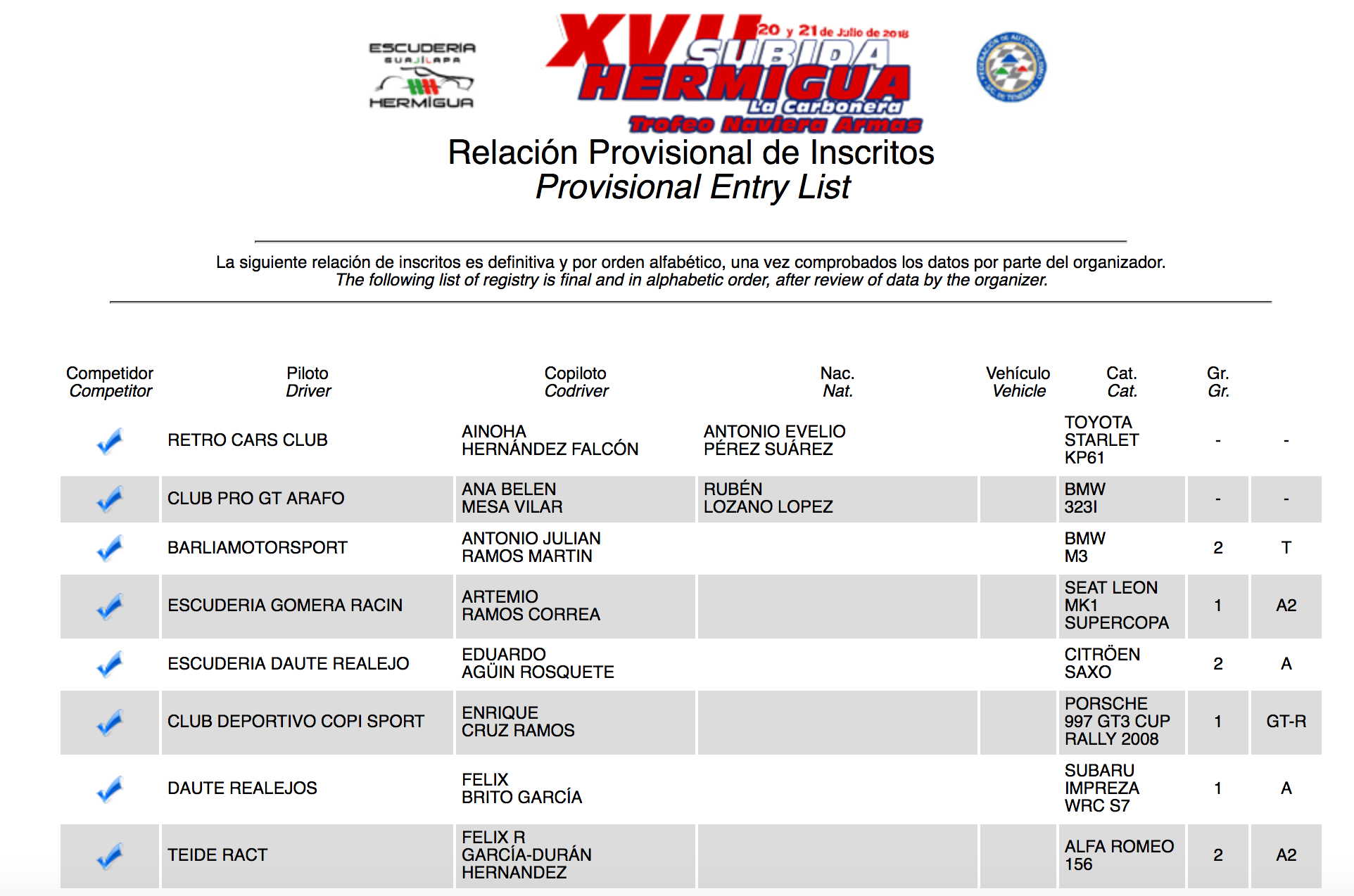 A falta de oficialización, ya se sabe que estarán presentes en el apartado de turismos el grancanario Luis Monzón (Audi R8 LMS), el lanzaroteño Yeray Lemes (Porsche 911 GT3 2010), los tinerfeños Enrique Cruz (Porsche 911 GT3 2008), Félix Brito (Subaru Impreza WRC), Jonathan García Palenzuela (Ginetta G50 GT4) y Félix Ramón García Durán (Alfa Romero 156).
