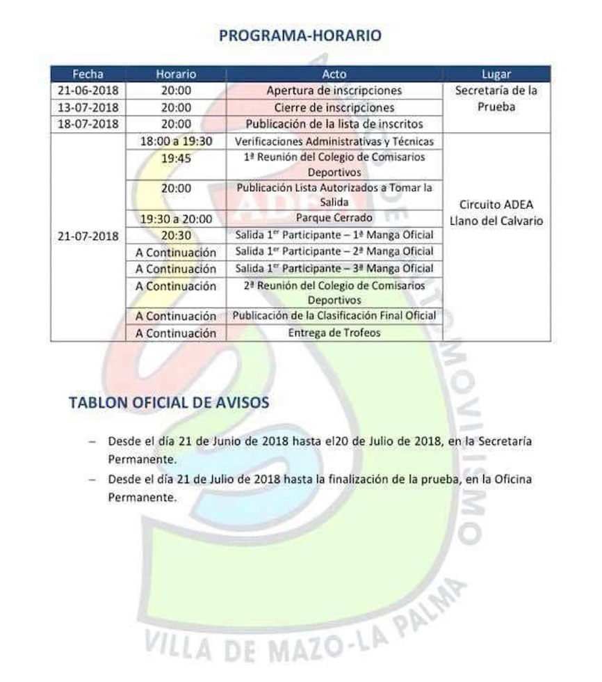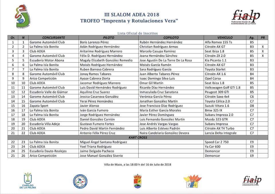 Este sábado se disputará en el Circuito Adea, en Mazo, La Palma, III Slalom Adea 2018 «Trofeo Imprenta y Rotulaciones Vera», con la novedad de que en esta ocasión serán tramos nocturnos, puesto que a las 20:30 horas arrancará el primero de los participantes.