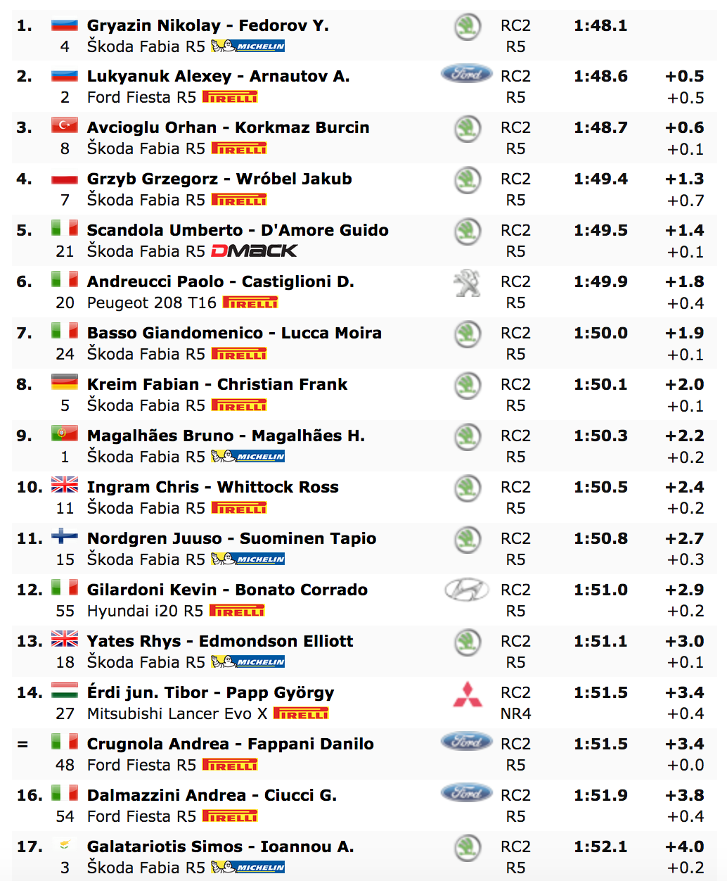 Nikolay Gryazin continuó con su buen estado tras ganar primero la etapa de clasificación del Rally di Roma Capitale el pasado jueves, venciendo al favorito del Campeonato de Europa de Rallyes de la FIA, Alexey Lukyanuk, en la prueba de apertura del rallye este viernes.