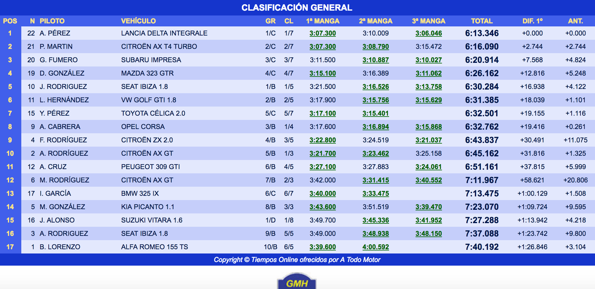Gracias a unos dos mejores cronos de 3:07.300 y 3:06.046, logrados en la primera y tercera manga, les valió para superar en 2.744 a Pedro David Martín y Luis Alberto Estévez (Citroën AX 4X4). Terceros finalizaron Gustavo Fumero y José Andrés Vargas (Subaru Impreza), a 7.568.