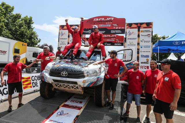Rosa Romero, se ha proclamado ganadora de la Baja Aragón en categoría femenina de motos, acompañada en este pódium por Sara García y Rita Vieira. Al final del tramo, al filo de las 11 de la mañana, la lluvia ha hecho acto de presencia y ha hecho que las últimas motos llegaran a meta con frío y dificultades, pero finalmente un total de 64 han logrado terminar la especial y finalizar esta XXXV edición de la Baja. Siguiendo la tendencia de esta edición, el checo Jaroslav Valtr se ha hecho con su primera victoria en la Baja Aragón a bordo de un camión del Bonver Team, seguido del ganador del año pasado, su compatriota Martin Macik, que ha terminado en un meritorio segundo puesto tras haber disputado toda esta cita con una lesión en su pierna que le obligaba a utilizar muletas.