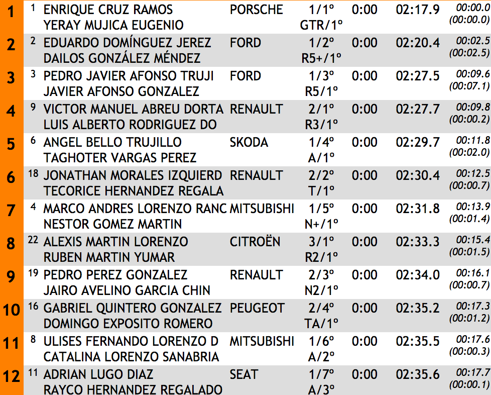 Los componentes del equipo Copi Sport invirtieron un tiempo de 2:17.9, lo que les valió para superar a Eduardo Domínguez y Dailos González (Ford Fiesta R5) en 2.5, siendo terceros los otros ocupantes de un Fiesta R5, Pedro Javier Afonso y Javier Afonso, que se quedaban a 9.6 de la cabeza y a 7.1 del segundo puesto, aunque superando en solo 0.2 a unos soberbios Víctor Abreu y Luis Alberto Rodríguez, que llevaron su pequeño Renault Clio R3 al cuarto lugar pero a nada del último escalón del podio.
