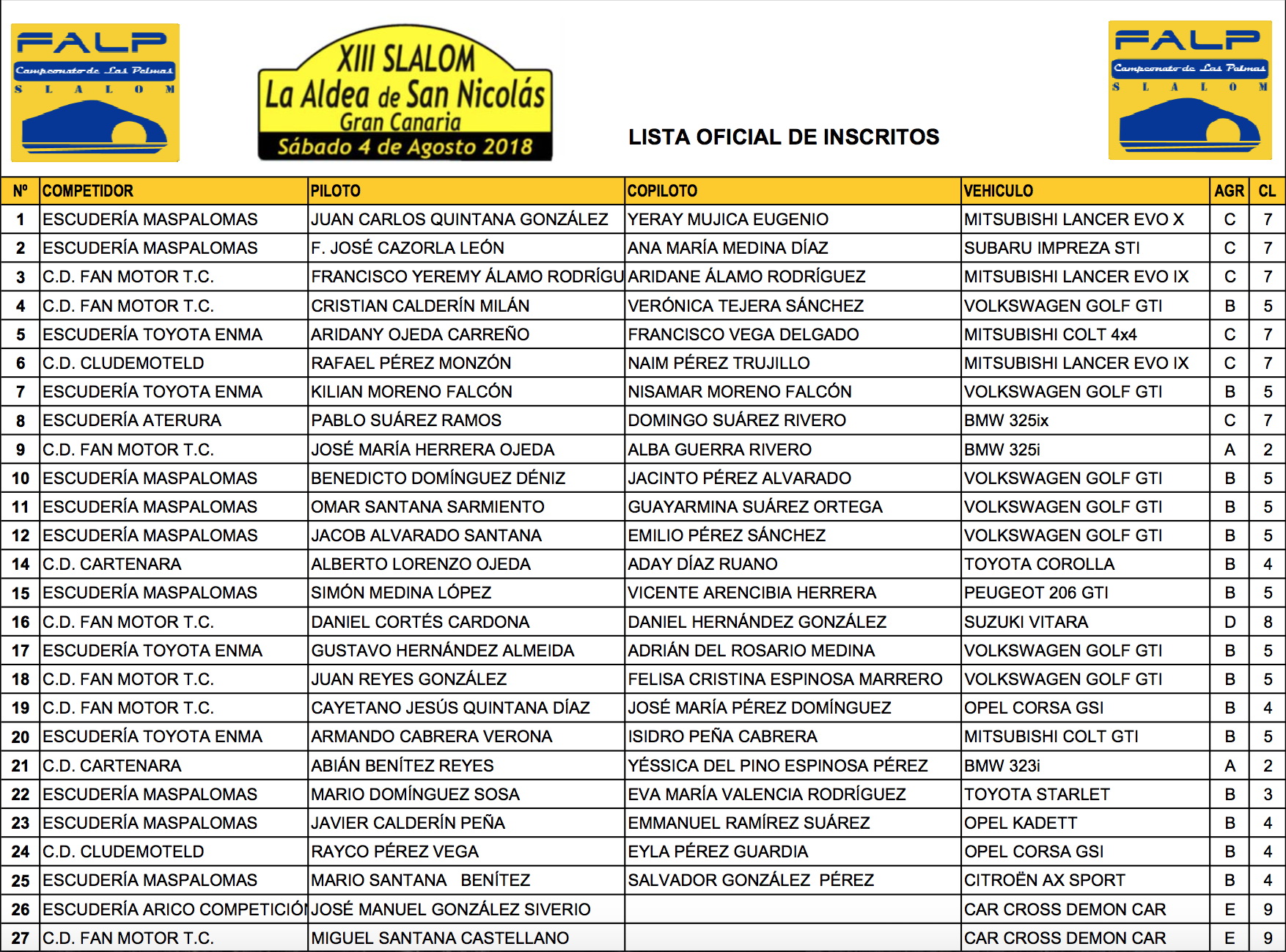 Este año, el slalom se disputa en una sola jornada, pero con dos pasadas más al tramo cronometrado del Barranco de La Aldea. Sene Cazorla perdió en 2017 la hegemonía de triunfos acumulados, ya que Juan Carlos Quintana se imponía en los dos slaloms del fin de semana. Por lo que de seguro, el sábado habrá una muy amistosa revancha, entre estos dos pilotos especialistas en rallys de tierra y que se conocen muy bien.