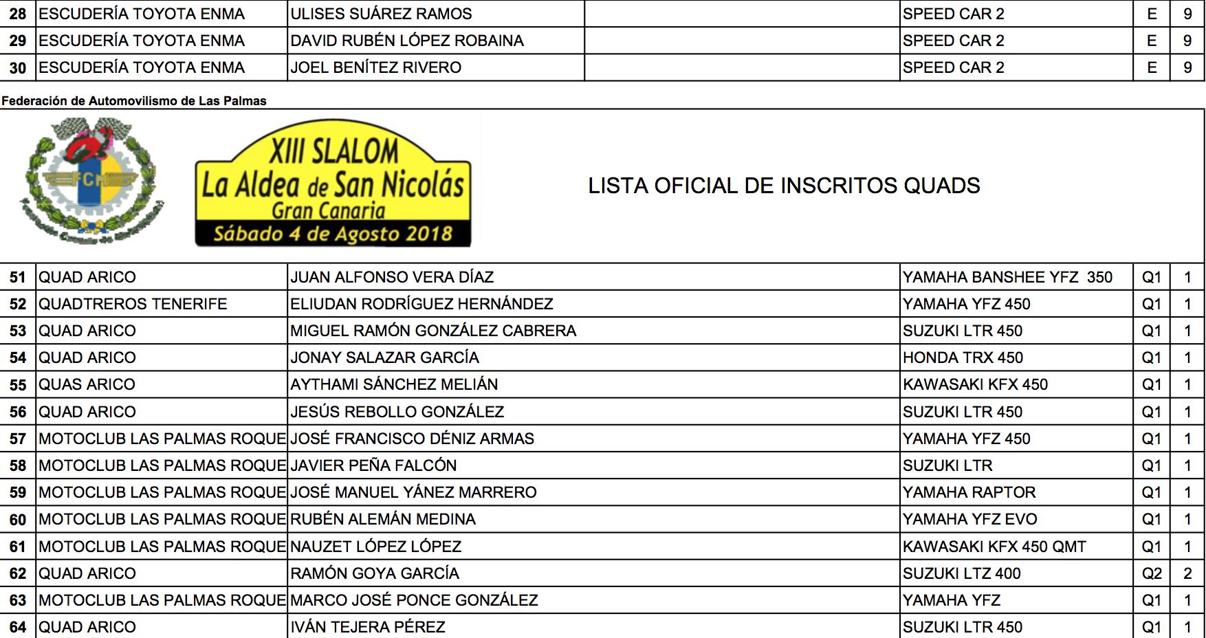 Pasando al mundo de los quads, la amplia acogida de pilotos de Gran Canaria y Tenerife se traduce en ausencia de candidatos claros a la victoria en La Aldea, aunque por buenos resultados destacan Juan Alfonso Vera y Fran Déniz.