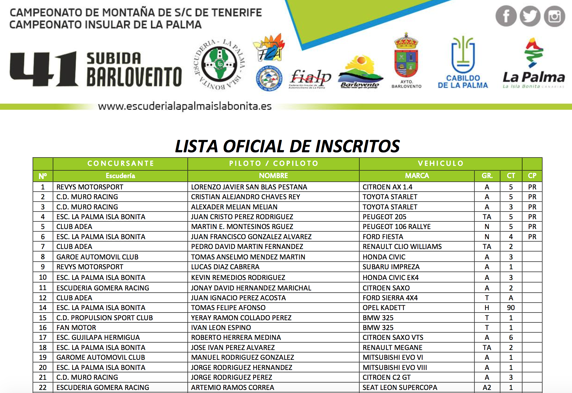 Numerosa, atractiva y muy variada. Así se presenta la inscripción de la Subida a Barlovento, una cita que un año más ha vuelto a despertar el interés de los participantes. Puntuable para el Campeonato de Montaña de S/C de Tenerife y para el Campeonato Insular de La Palma, está organizada por la Escudería La Palma Isla Bonita.