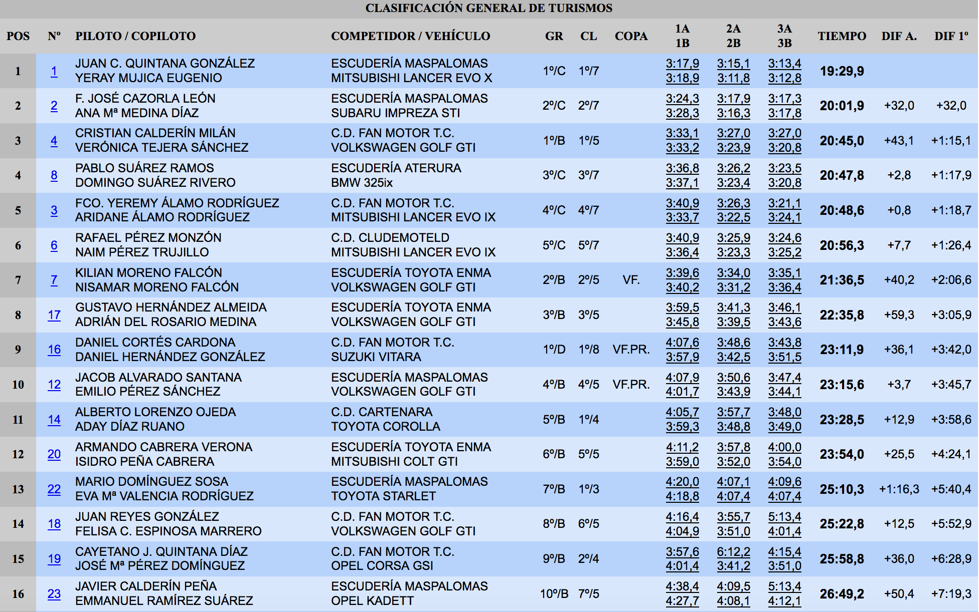 Alberto Lorenzo-Aday Díaz ganaron en la Clase 4, mientras Mario Domínguez-Eva Valencia lo hacían en la Clase 3 y Abián Benítez-Yésica Espinosa ganaban en la Clase 2 de vehículos de propulsión trasera, donde se quedaban solos tras la retirada de Chema Herrera por rotura de transmisión.